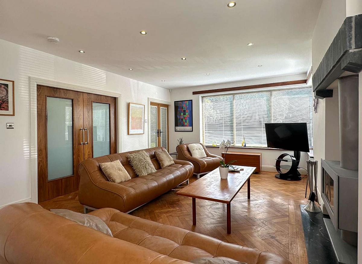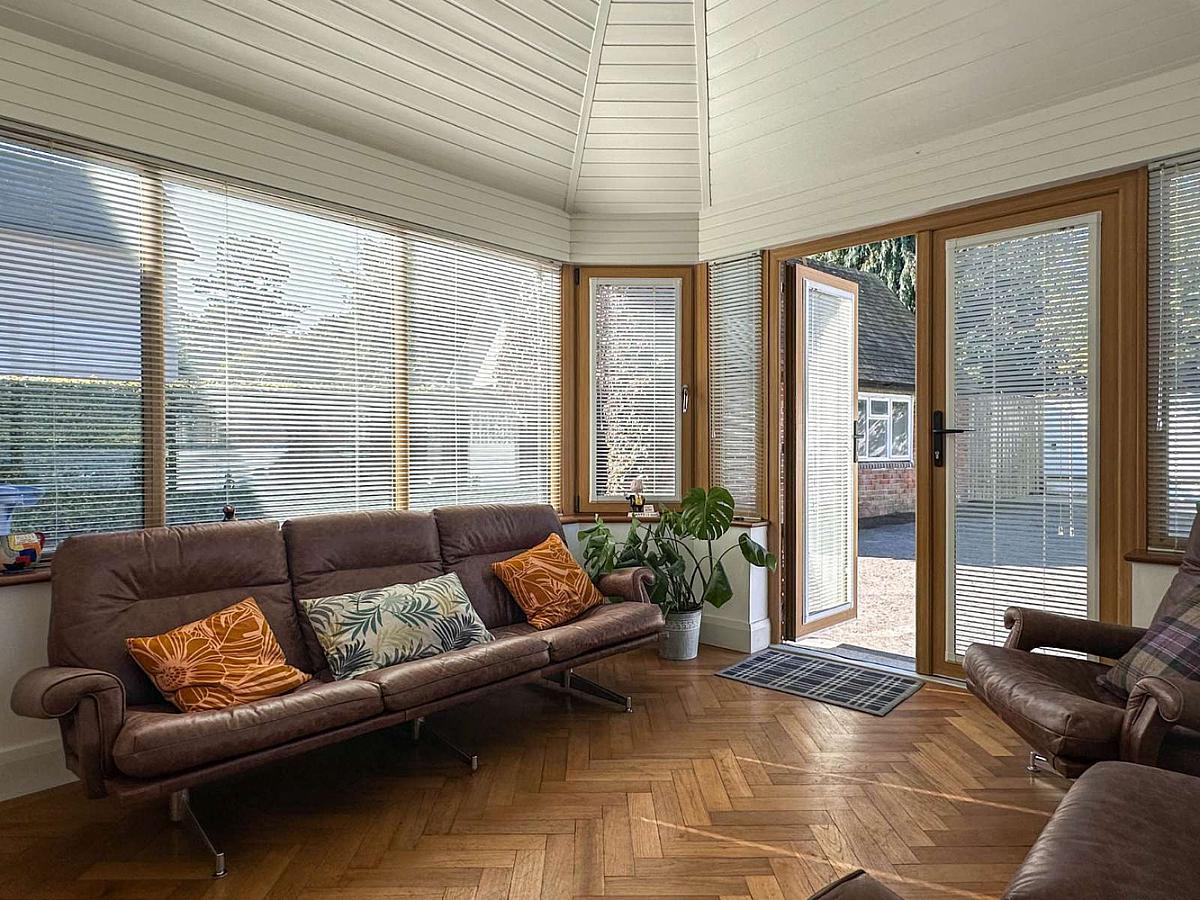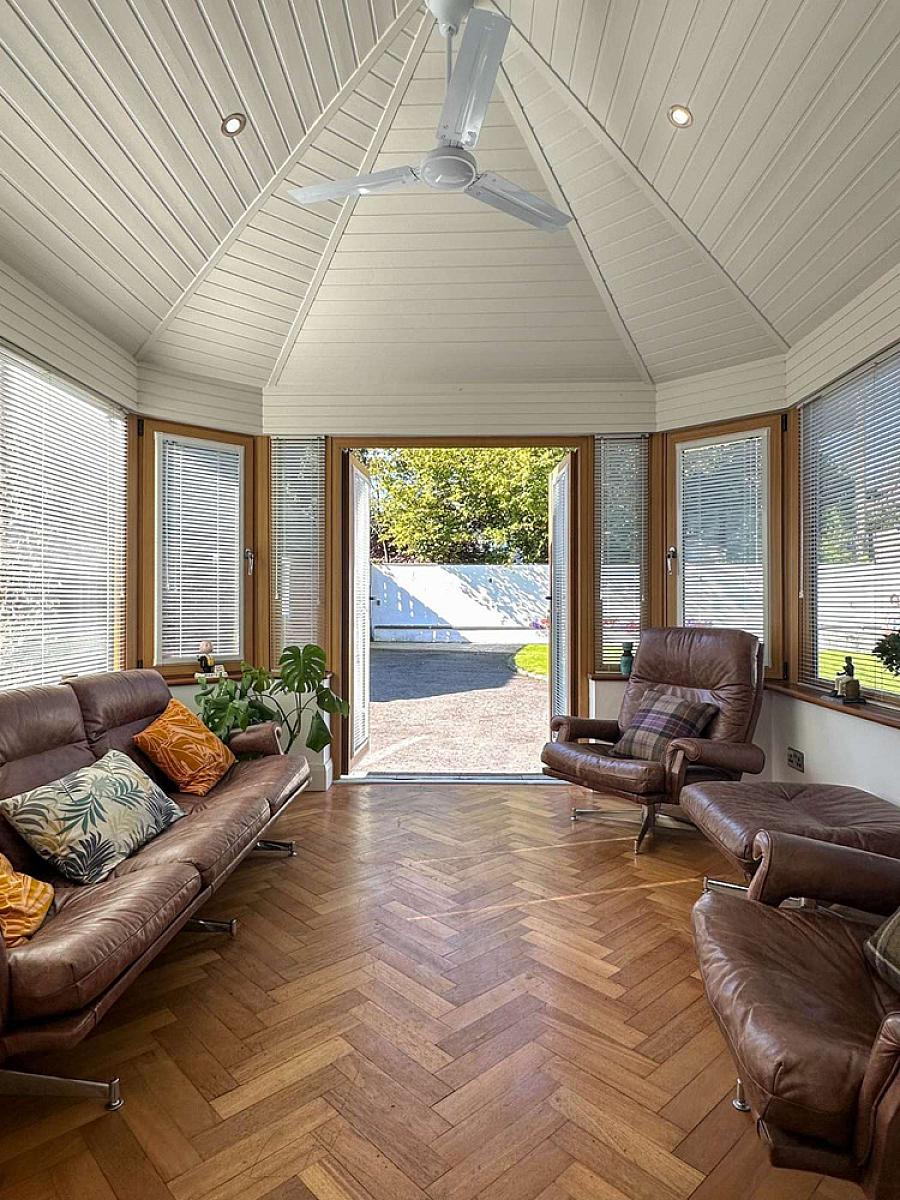 (MAX) With Oak woodblock flooring, vaulted ceiling with recess lighting, Woodgrain uPVC glass panel French doors to the rear garden.
