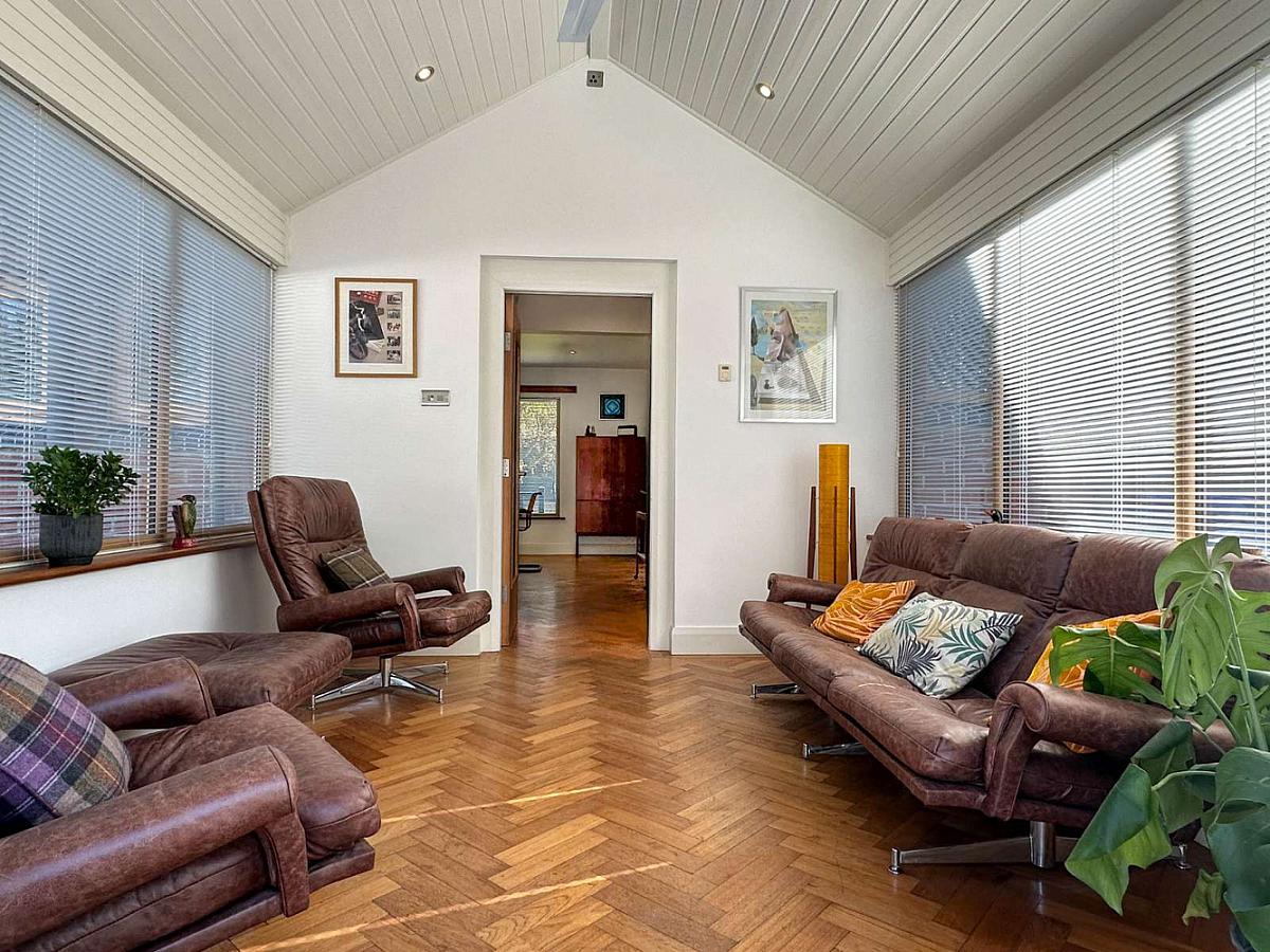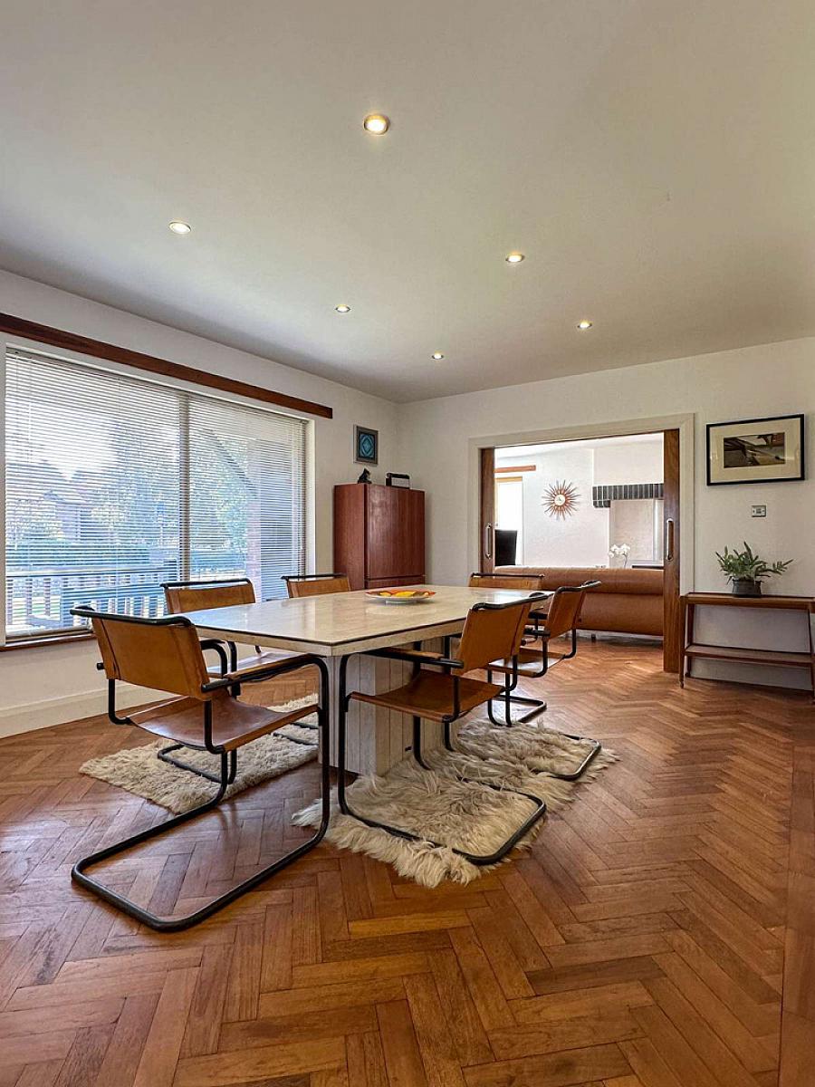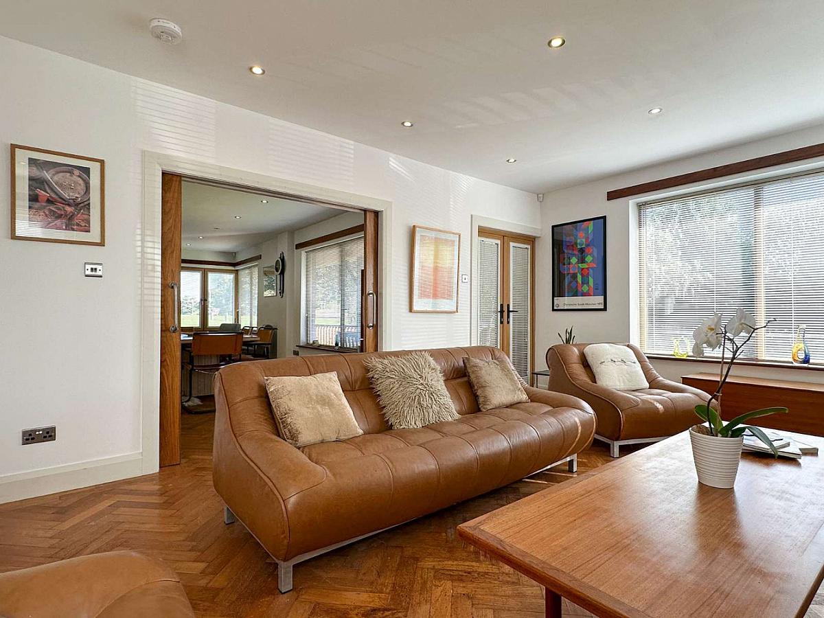 (MAX) With Oak woodblock flooring, vaulted ceiling with recess lighting, Woodgrain uPVC glass panel French doors to the rear garden.