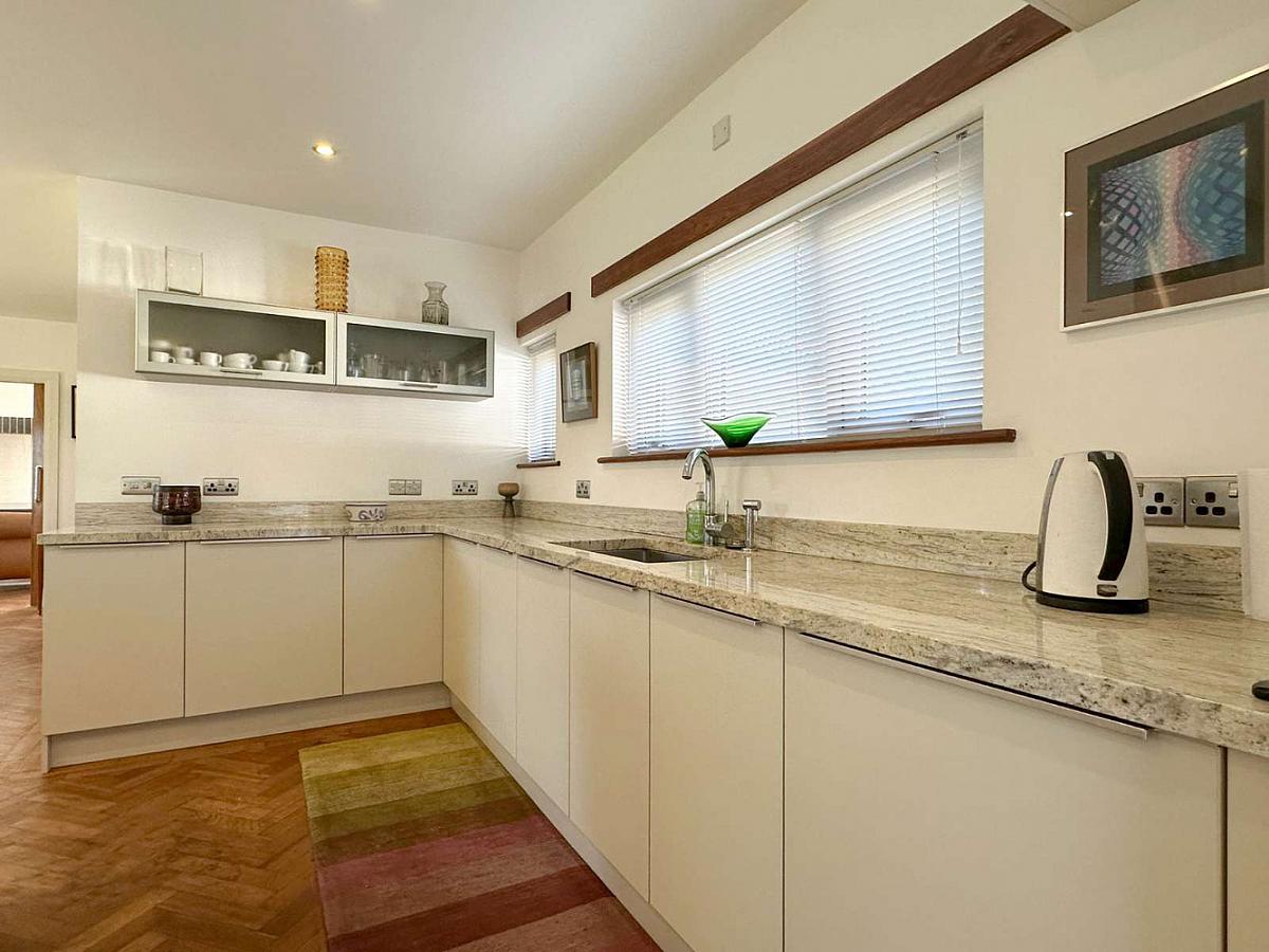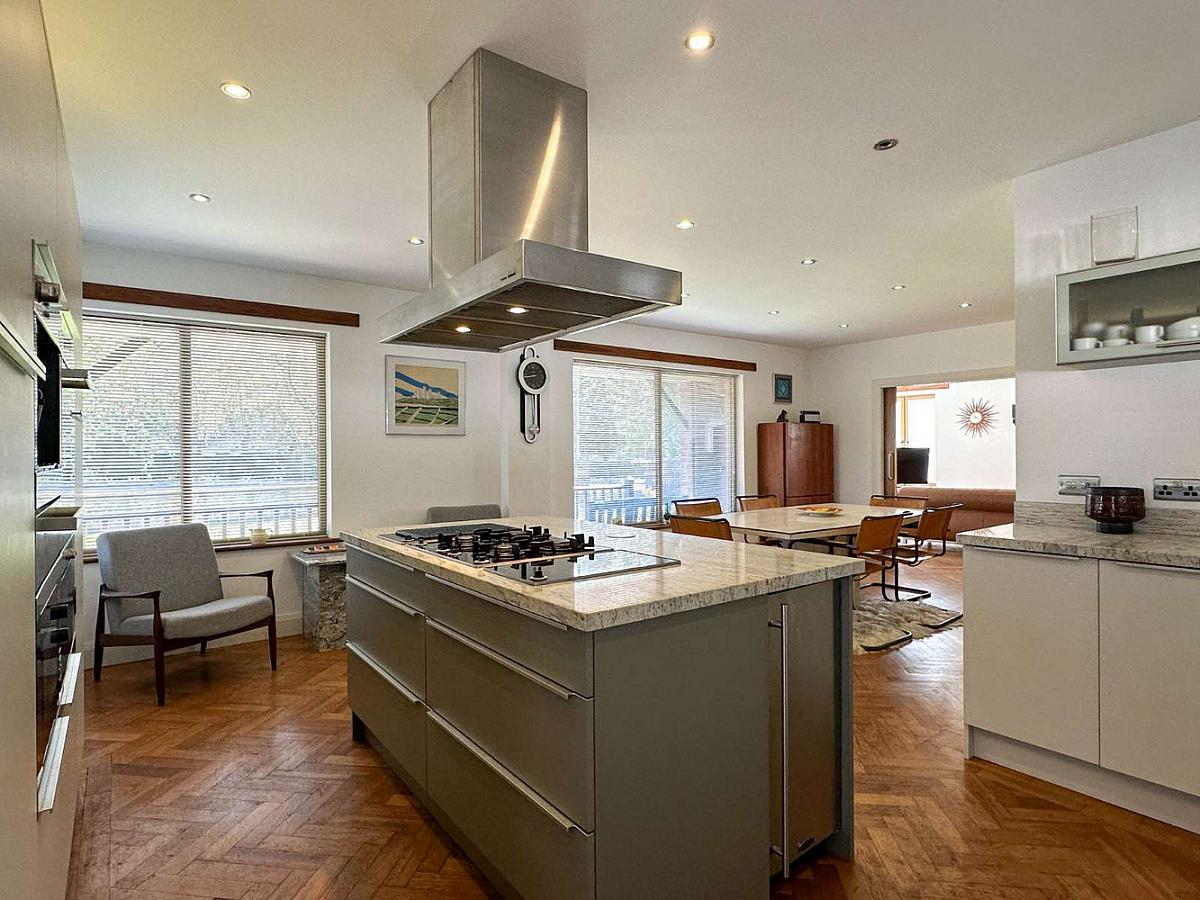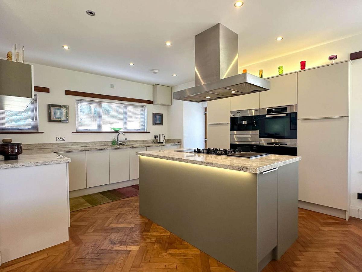 Modern kitchen units and large island unit including saucepan drawers and pull out larder unit, integrated freezer, Miele fridge, 2 slimline dishwashers, 4 ring gas hob, oven, steamer, microwave and coffee machine, grill, warming drawer and hotplate, granite worktop, stainless steel sink unit, pull up power points and USB charging points, Bulthaup stainless steel extractor fan, Rangemaster ice machine, Oak woodblock flooring, recess lighting, concealed lighting, feature corner window, telephone point, Woodgrain uPVC glass panel side door.