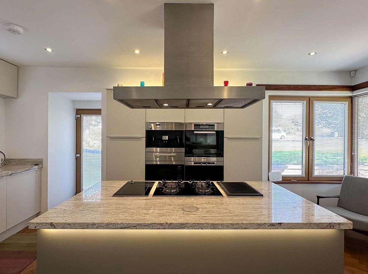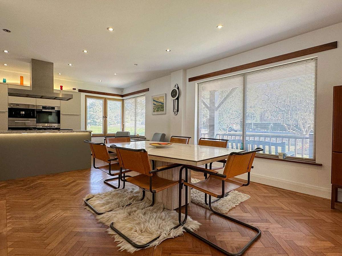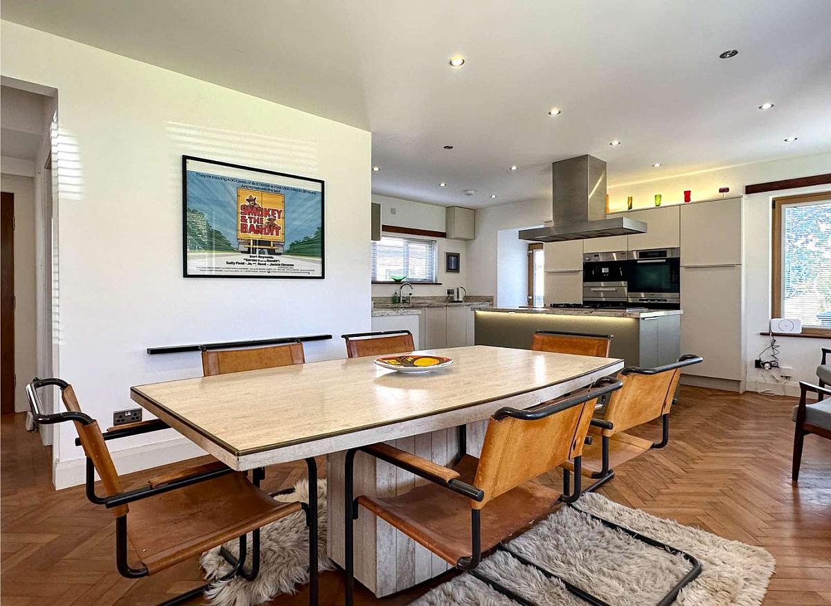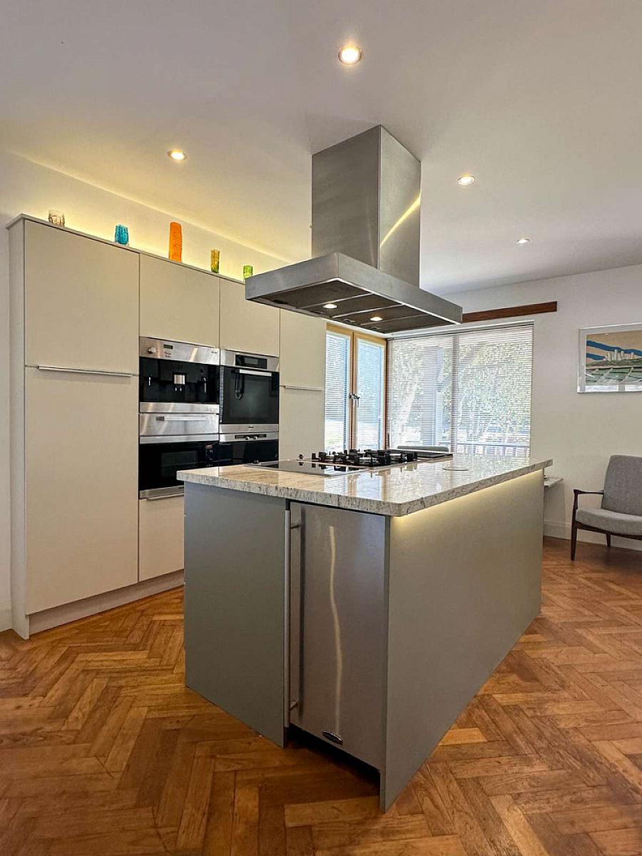 Modern kitchen units and large island unit including saucepan drawers and pull out larder unit, integrated freezer, Miele fridge, 2 slimline dishwashers, 4 ring gas hob, oven, steamer, microwave and coffee machine, grill, warming drawer and hotplate, granite worktop, stainless steel sink unit, pull up power points and USB charging points, Bulthaup stainless steel extractor fan, Rangemaster ice machine, Oak woodblock flooring, recess lighting, concealed lighting, feature corner window, telephone point, Woodgrain uPVC glass panel side door.