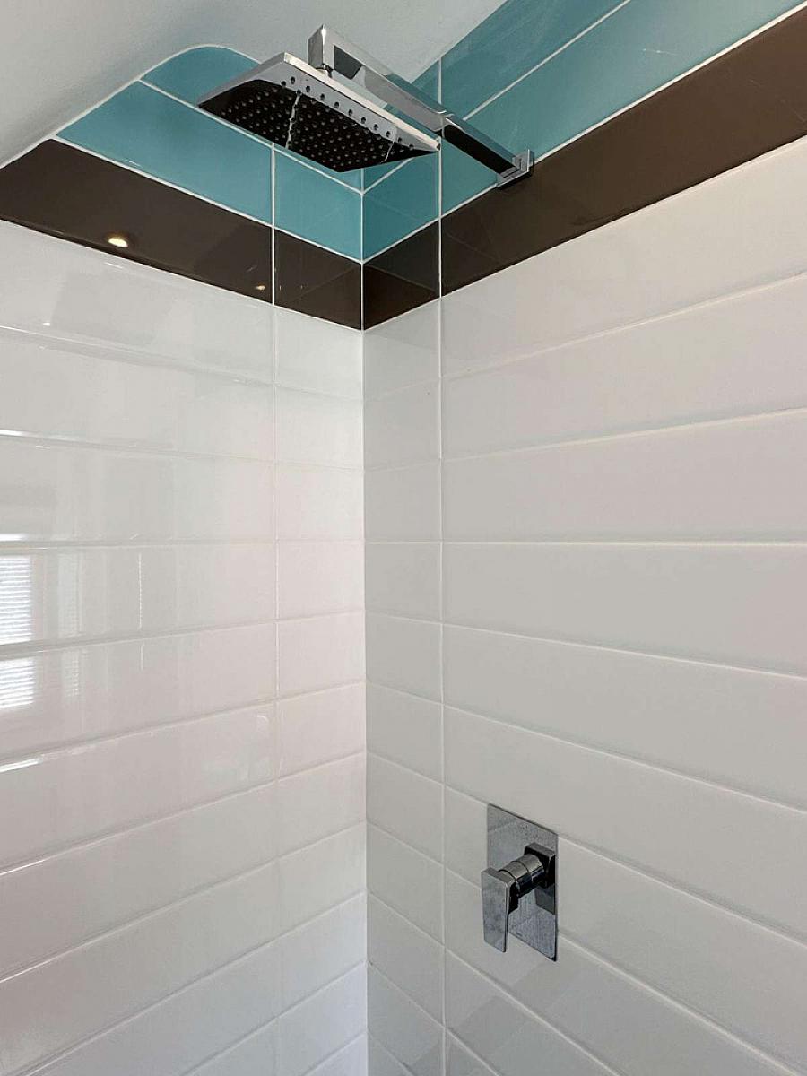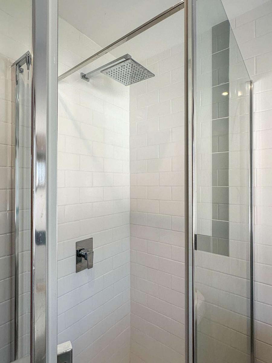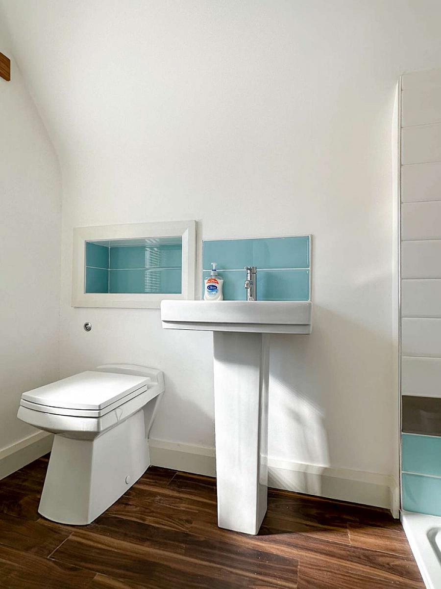 Comprising tiled shower enclosure (no door), mains rainfall shower fitting, wash hand basin, w.c., recess shelf, wooden effect flooring, recess lighting, wall mounted radiator.