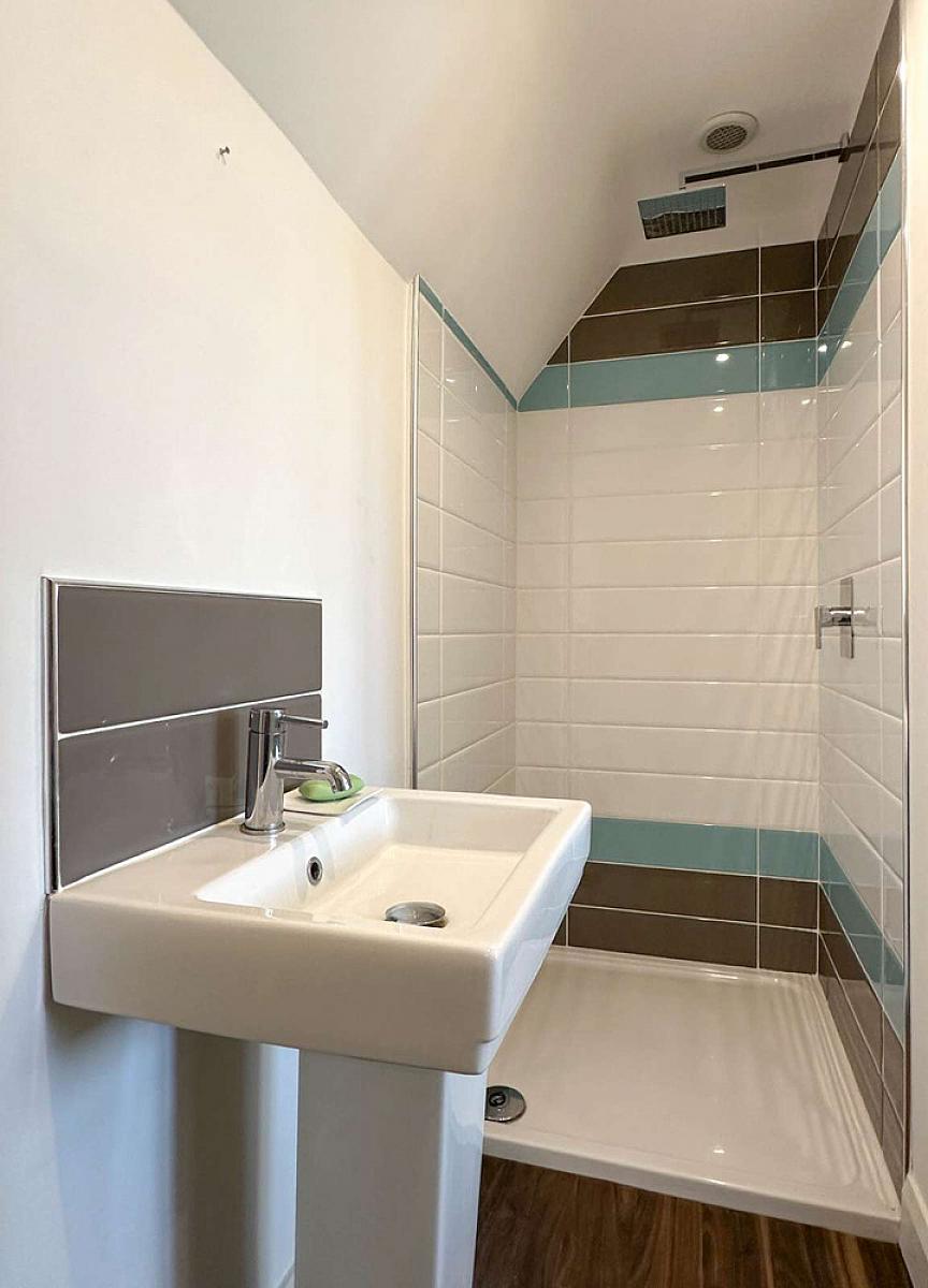 Comprising tiled shower enclosure (no door), mains rainfall shower fitting, wash hand basin, w.c., recess shelf, wooden effect flooring, recess lighting, wall mounted radiator, extractor fan.