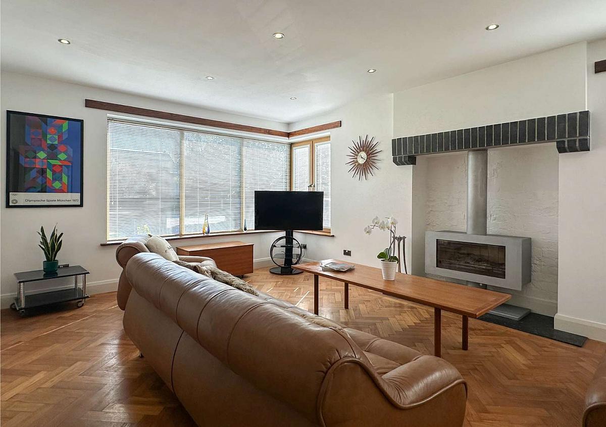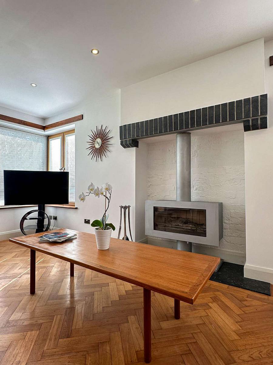 (MAX) Oak woodblock flooring (small section was left not done in order to build a built in media wall additional woodblock is available if required), raised glass fronted fire on marble tiled hearth, feature corner window, recess lighting, television point, glass panel sliding pocket doors leading to: