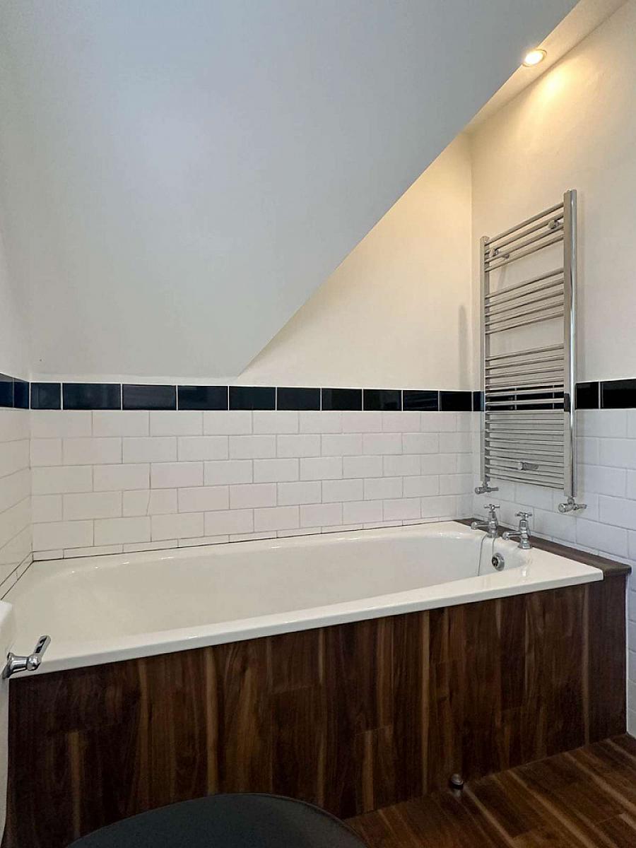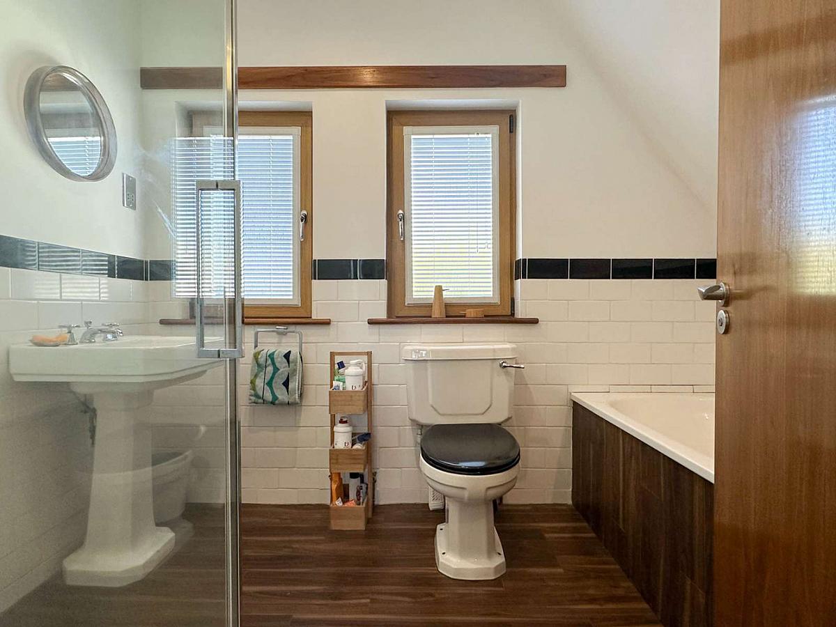 Comprising bath with tiling around, tiled shower enclosure with mains rainfall shower fitting, wash hand basin, w.c., wooden effect flooring, recess lighting, wall mounted radiator, extractor fan, half tiled walls.