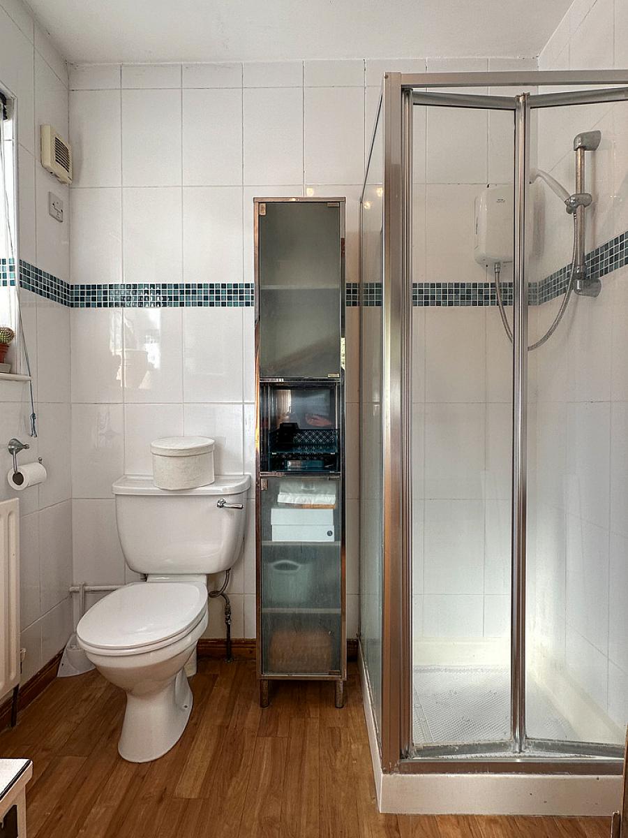 Comprising tiled shower cubicle with Triton electric shower fitting, corner wash hand basin, w.c., fully tiled walls, extractor fan, wooden effect flooring.