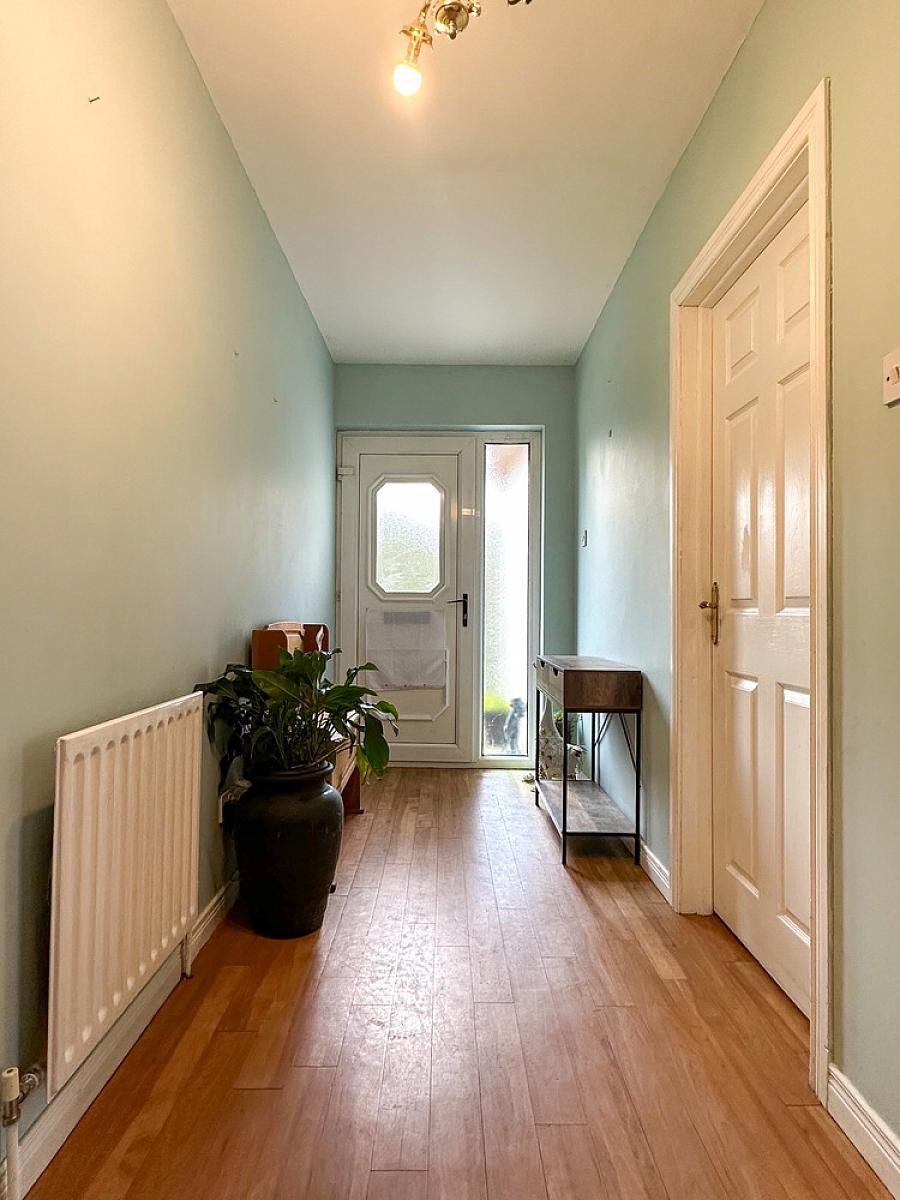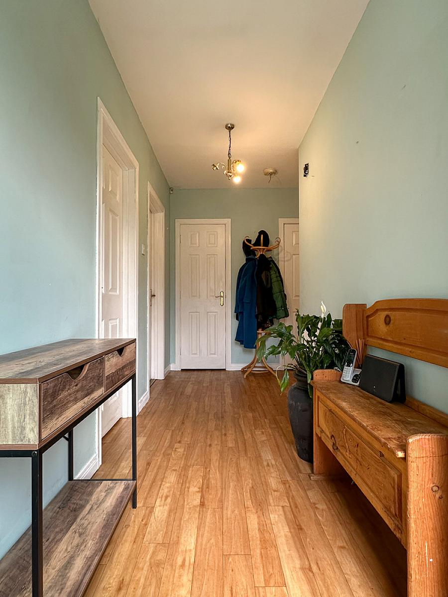 with uPVC glass panel front door with glass side panel, wooden effect flooring, cloaks cupboard, hot press, telephone point, access to roof space.
