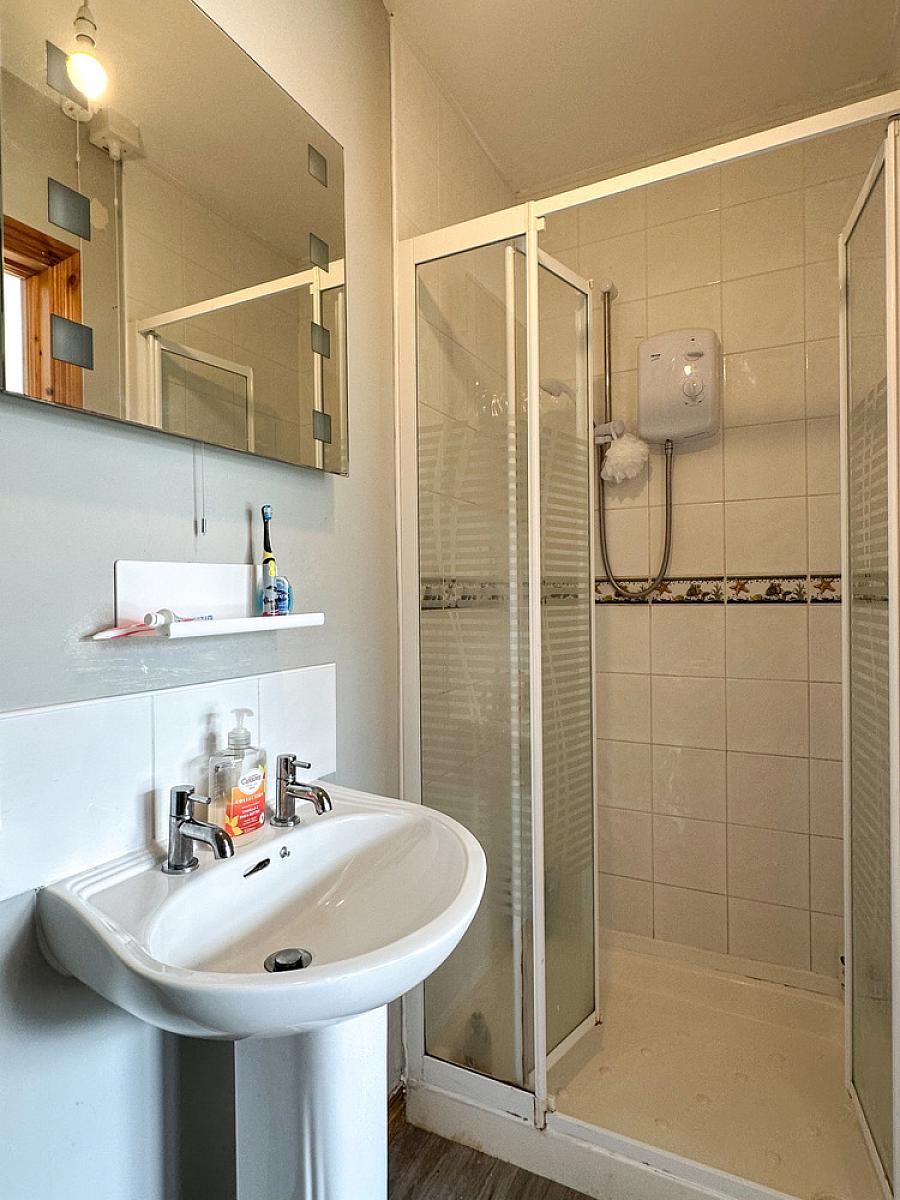 Comprising tiled shower cubicle with Triton electric shower fitting, wash hand basin, w.c., extractor fan.