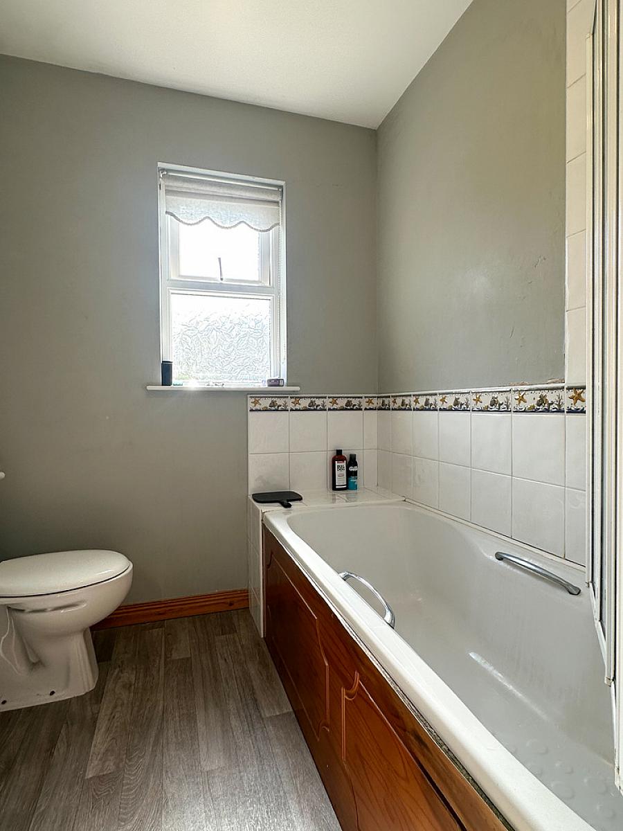 Comprising panel bath with tiling around, shower screen and Redring electric shower fitting over, wash hand basin, w.c..