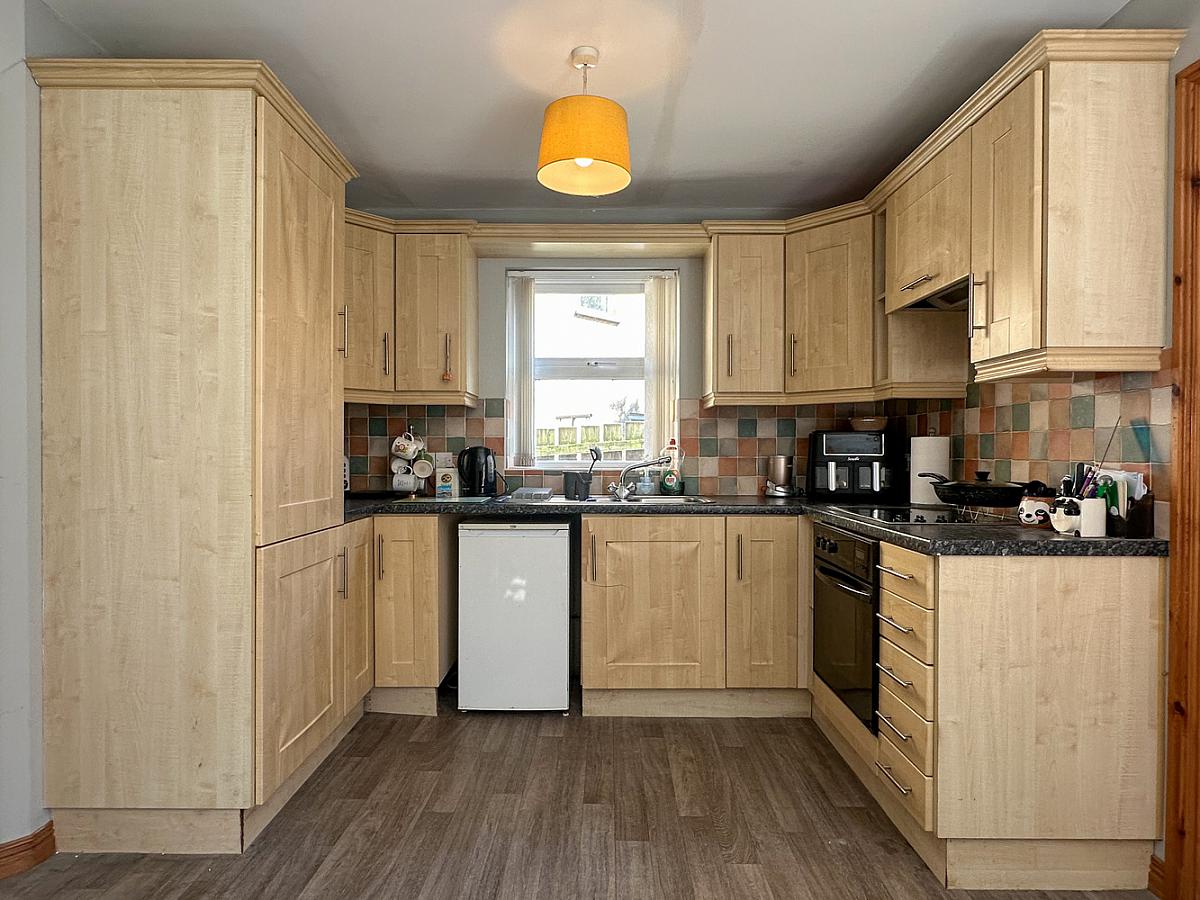 (Max) with eye and low level units, one and a half bowl stainless steel sink unit, tiled between units, oven and hob, extractor fan, integrated Beko fridge / freezer.