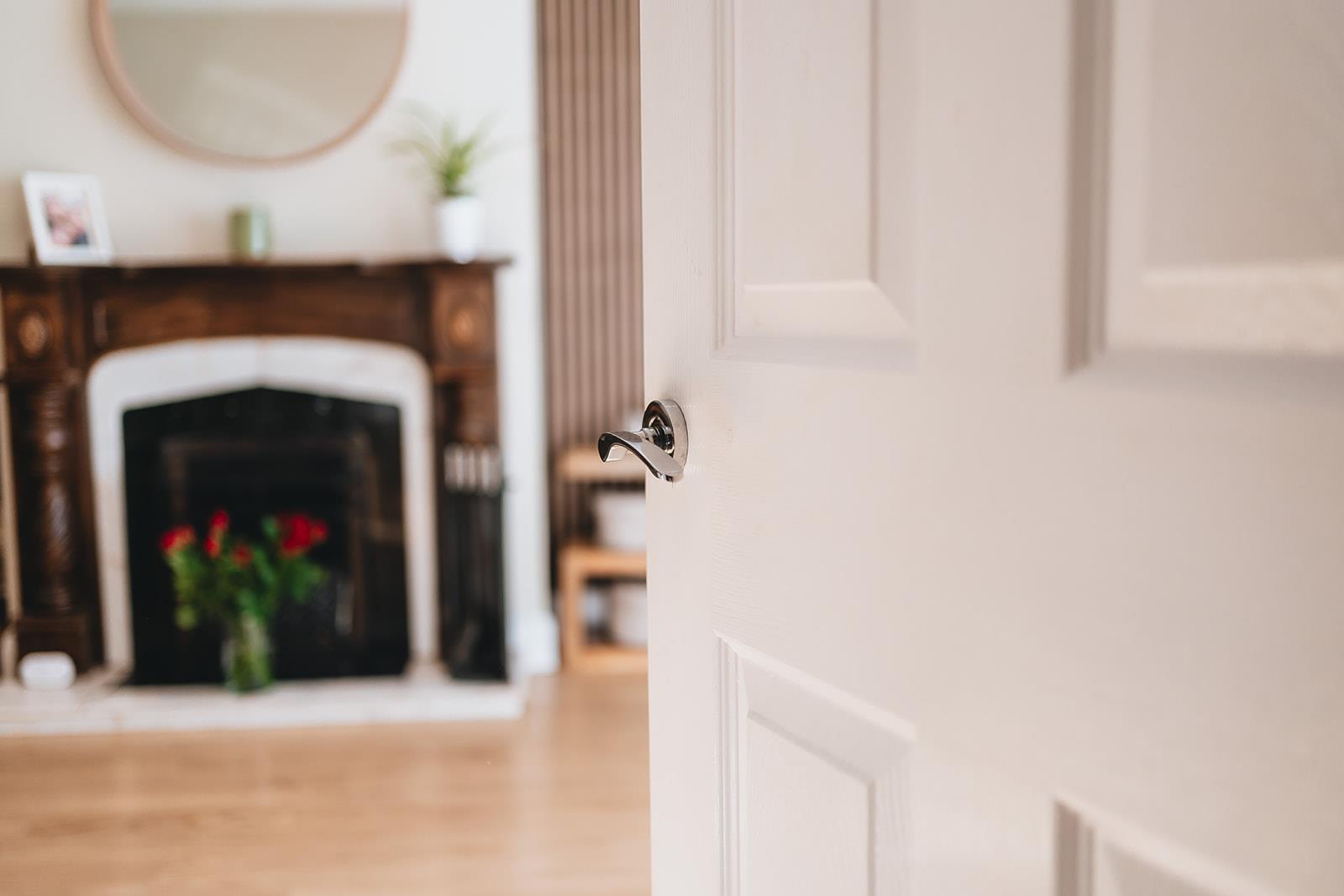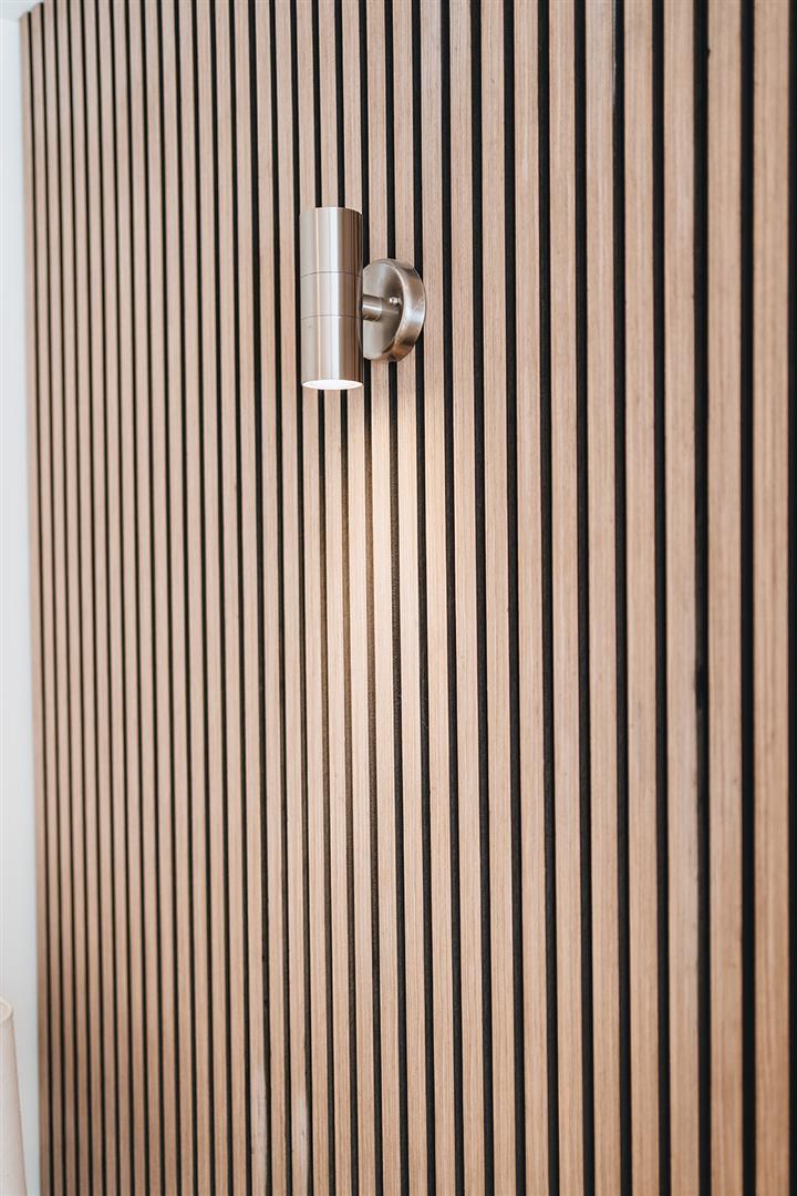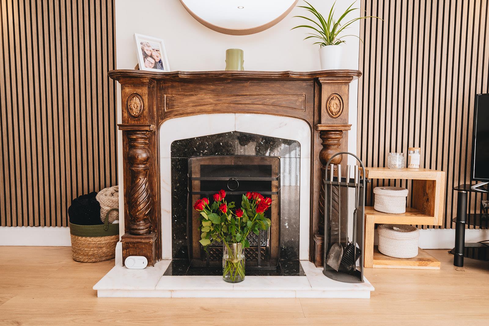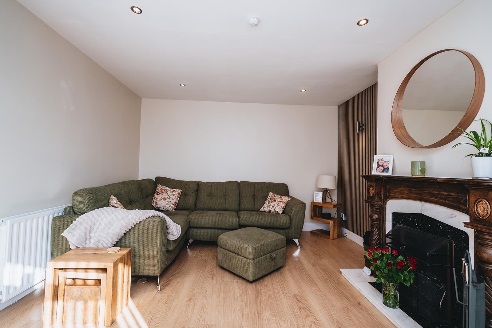 Feature wood surround fireplace wit granite inset and marble hearth, wood laminate flooring, feature wall panelling with wall lights, tv point and low voltage spotlighting.