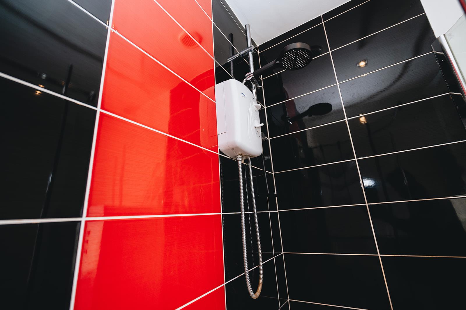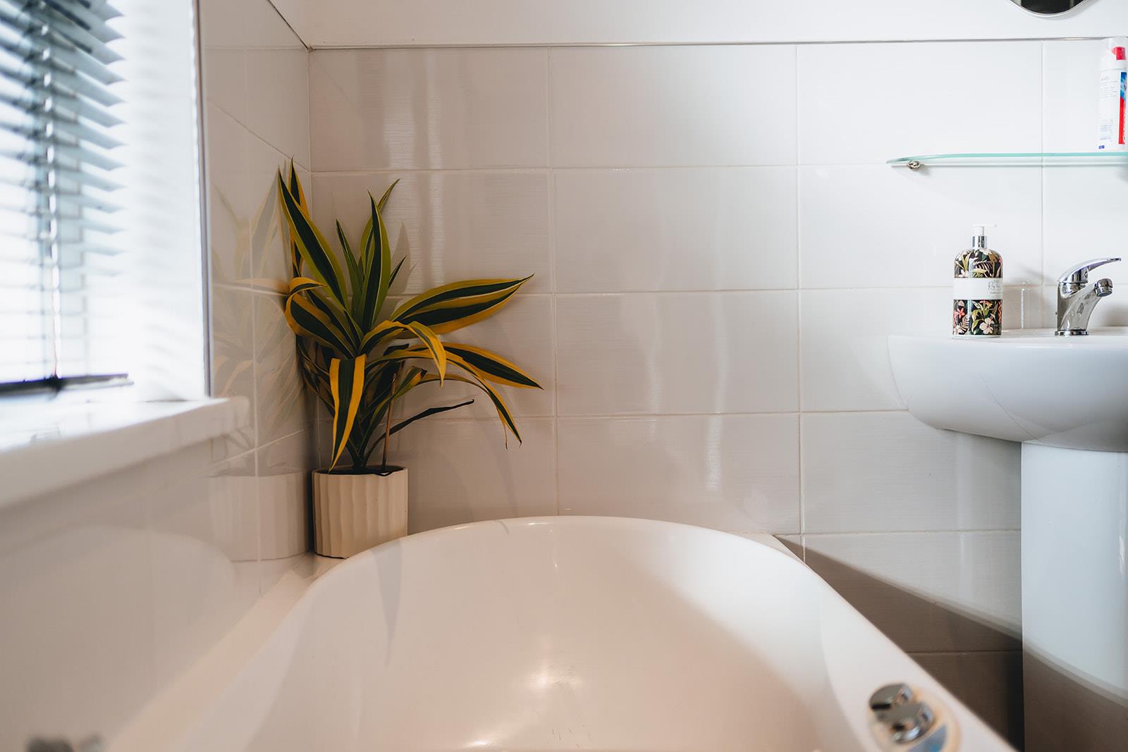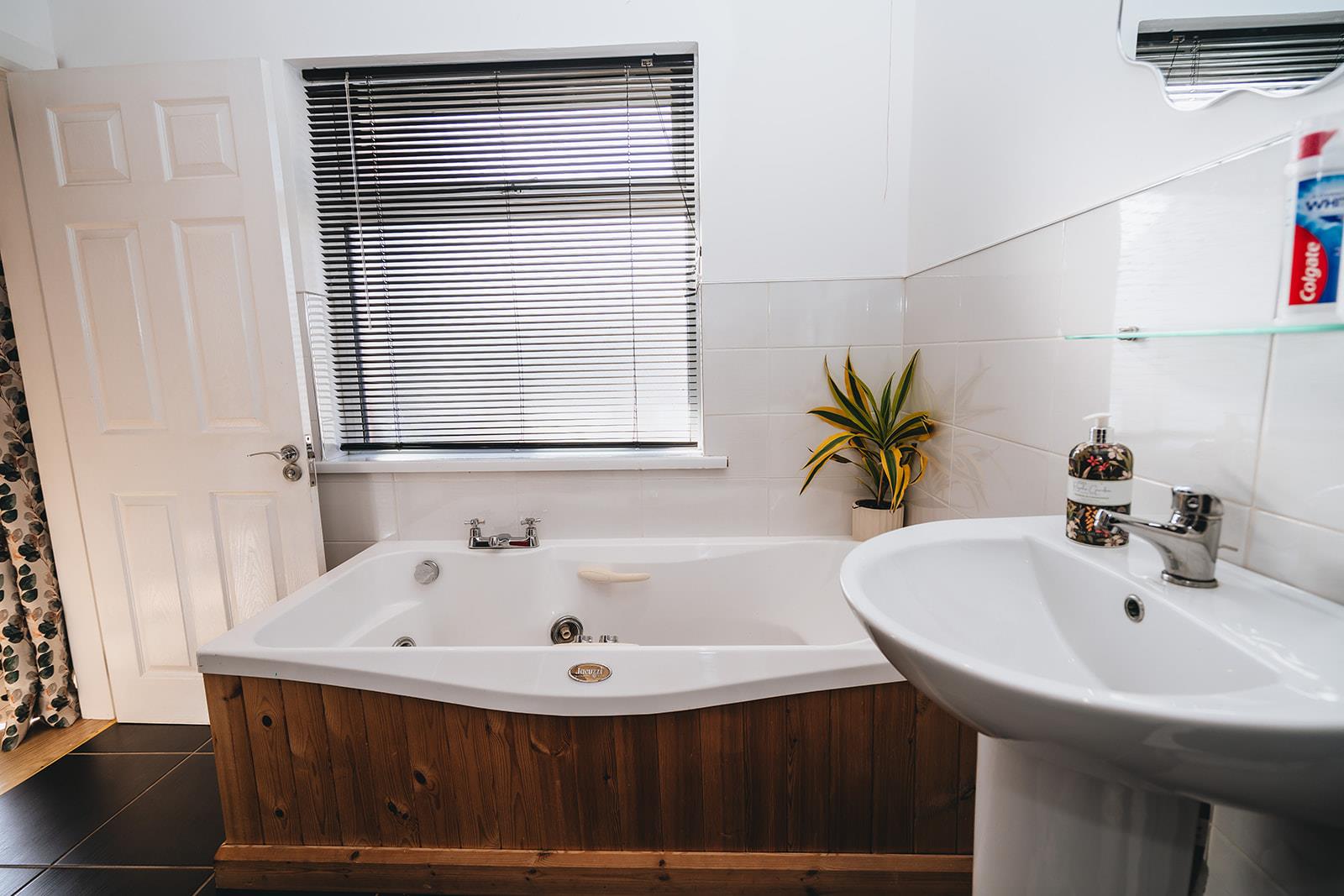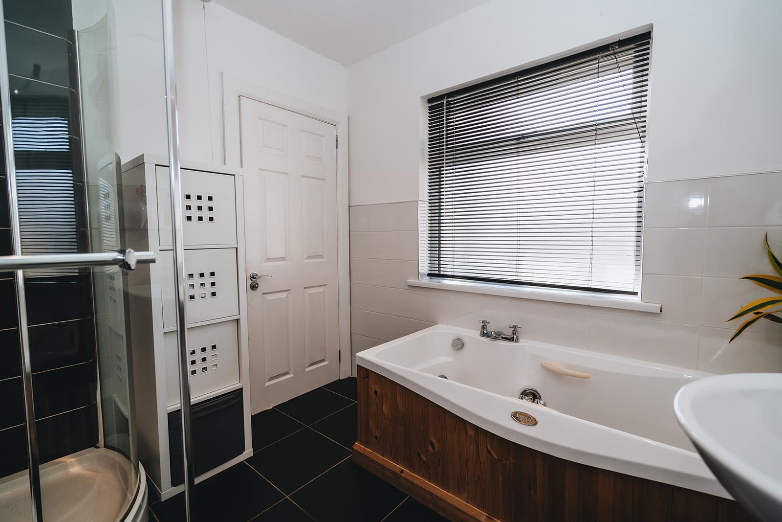 Family bathroom comprising Jacuzzi bath with mixer tap, pedestal wash hand basin with mixer tap, wc, tiled walk-in shower with Triton Enrich electric shower, low voltage spotlighting, part tiled walls and tiled floor.