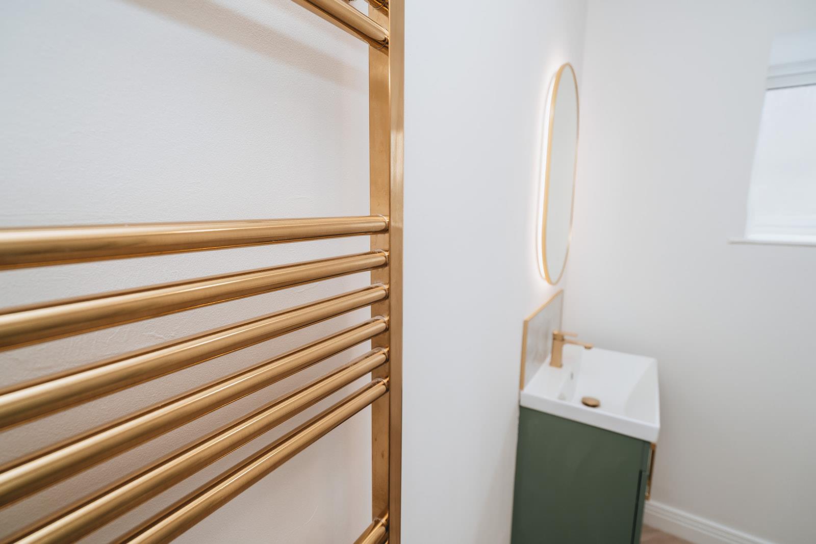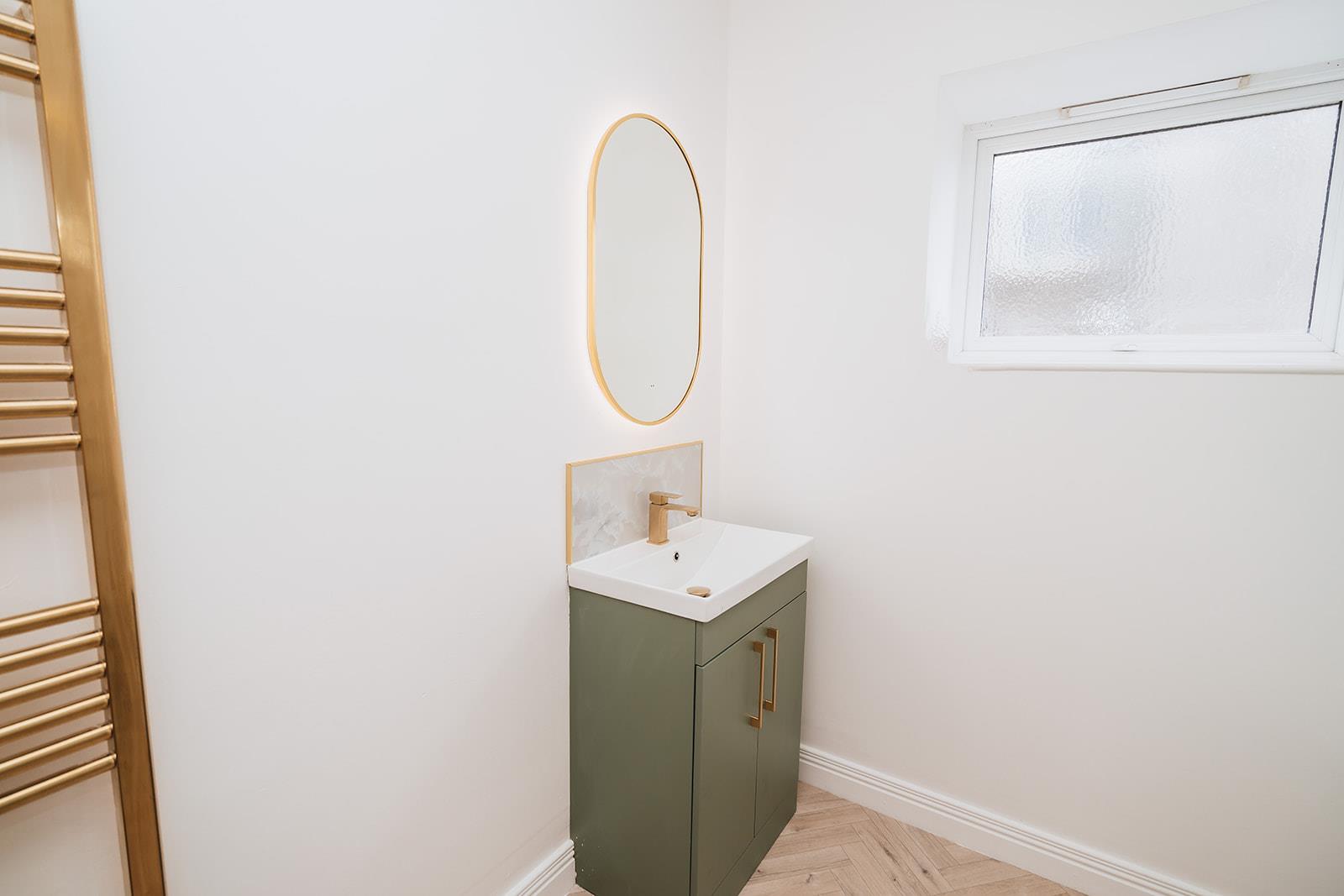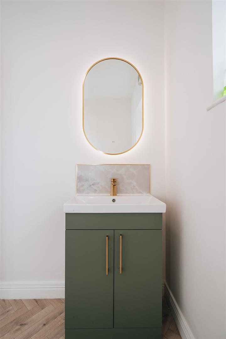 Recently refitted shower room comprising corner cubicle with acrylic panelling and Triton T80 electric shower with Rainfall showerhead attachment and hand shower attachment, vanity unit with wash hand basin, mixer tap and storage, electric touch sensitive mirror above basin, low flush wc and heated towel rail.