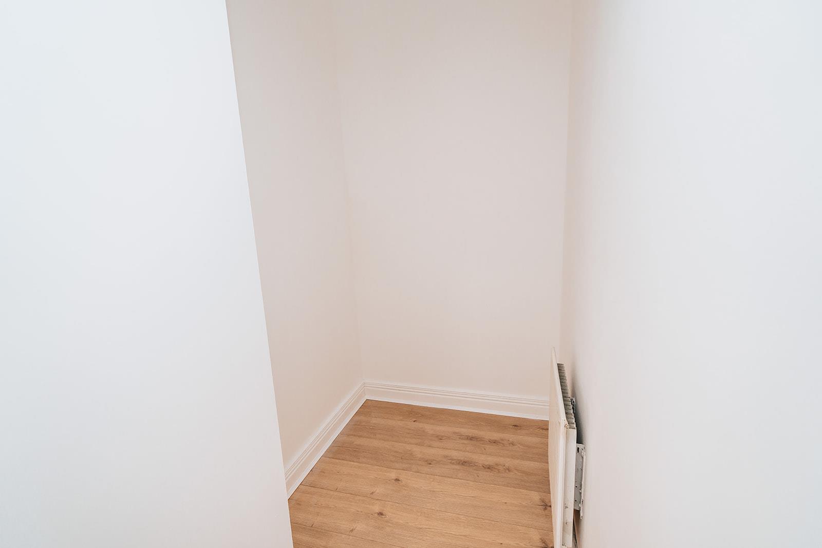 Wood laminate flooring, coving and alcove providing additional storage.