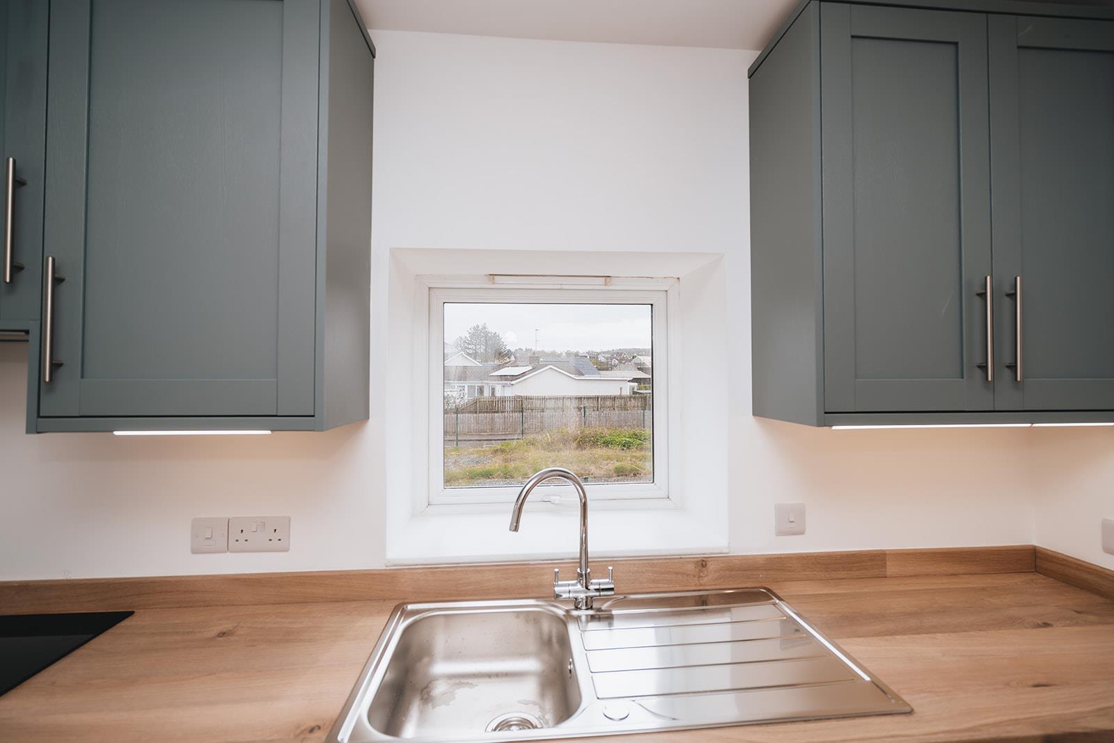The kitchen has been refitted with a range of high and low level units with concealed under lighting and comprises electric hob and under oven, extractor fan, integrated under fridge, washing machine and oil fired burner. Laminated worksurface with stainless steel sink and drainer.