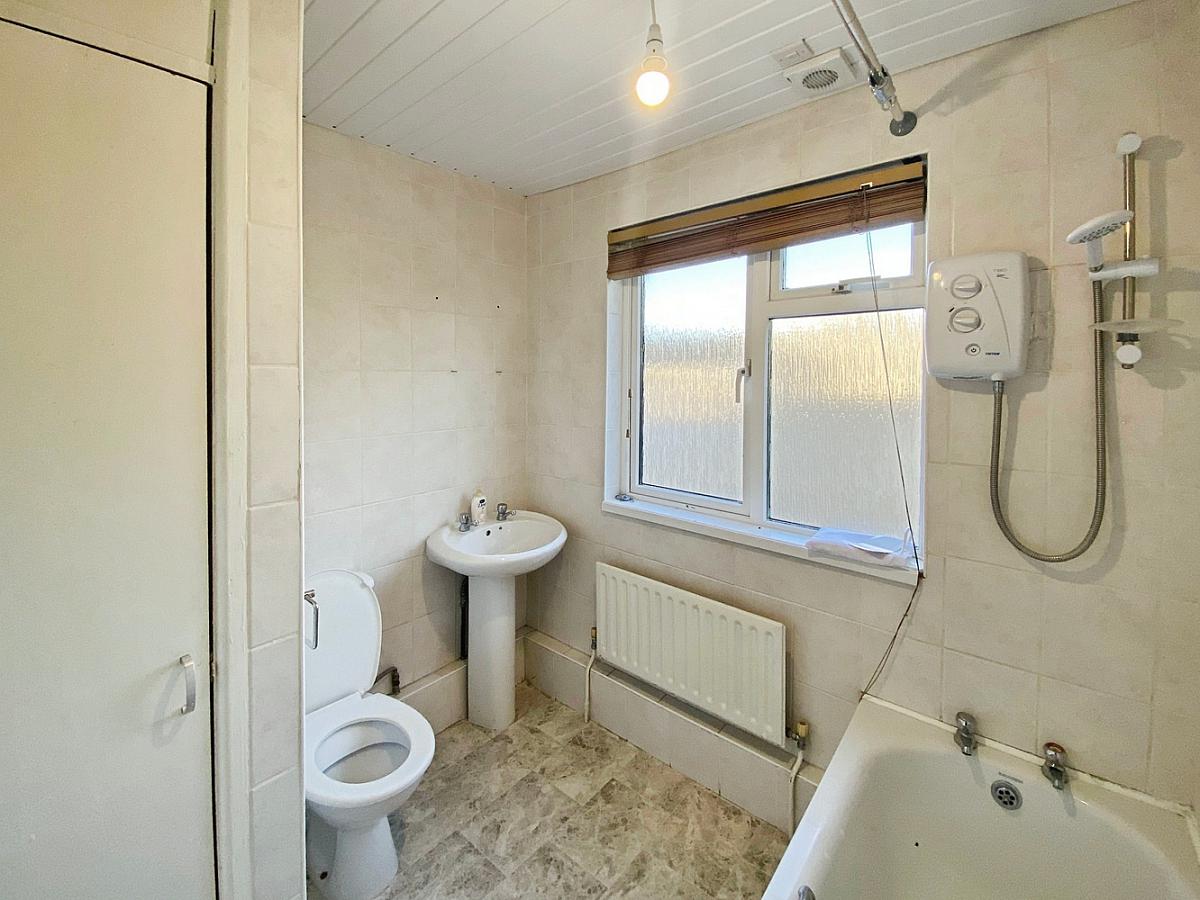 With WC, pedestal wash hand basin, shower over bath, fully tiled walls, extractor fan and shelved hot press.
