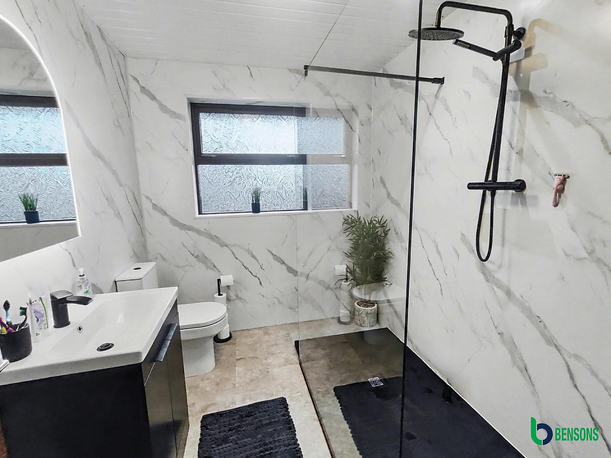 Suite comprising walk in shower enclosure with drencher head and power shower, wash hand basin with under storage, wc, heated towel, recessed light and extractor fan.