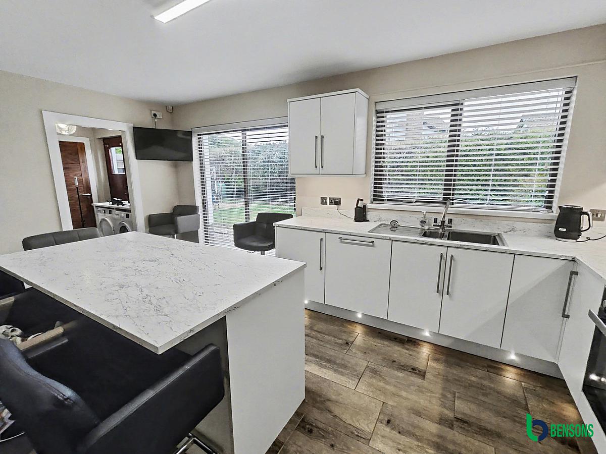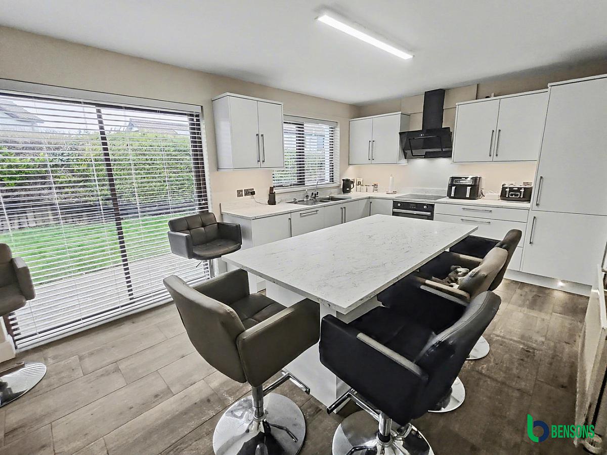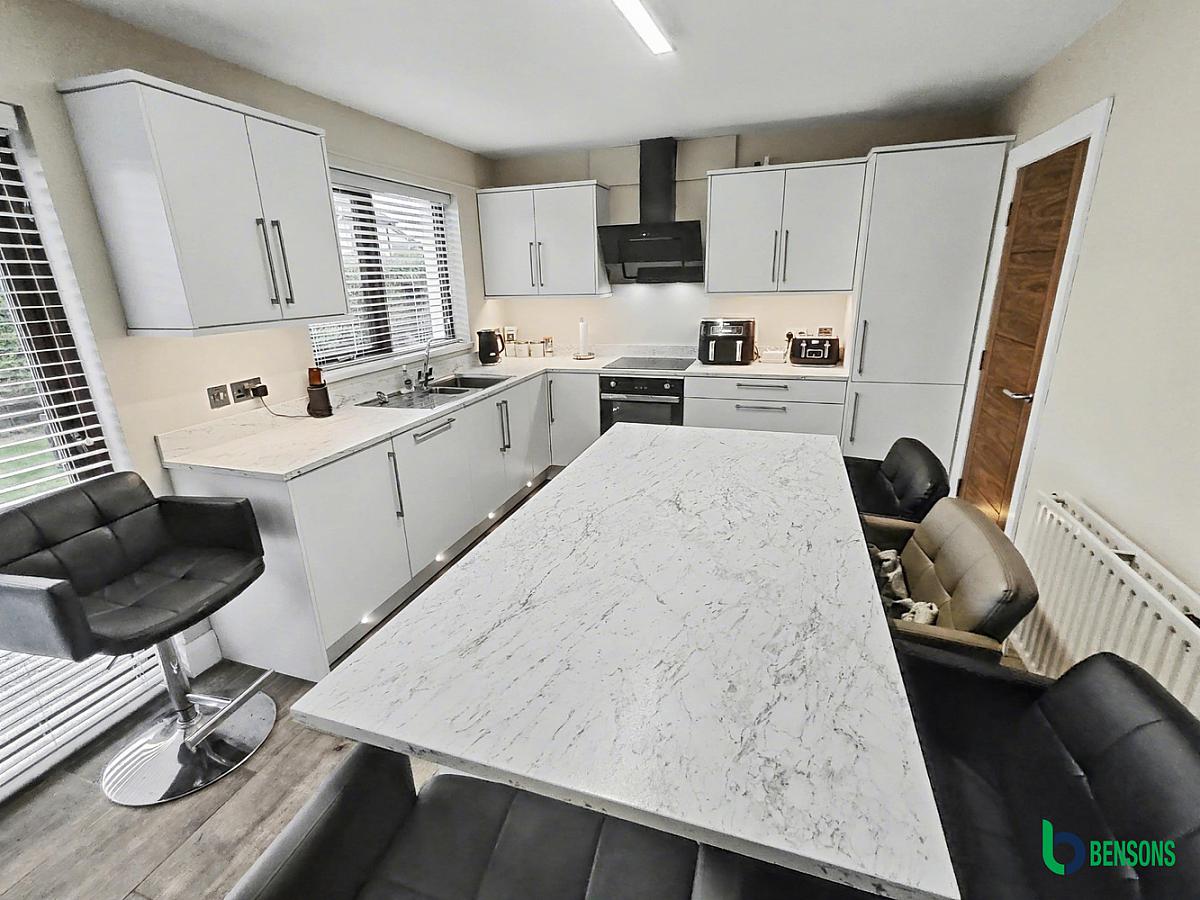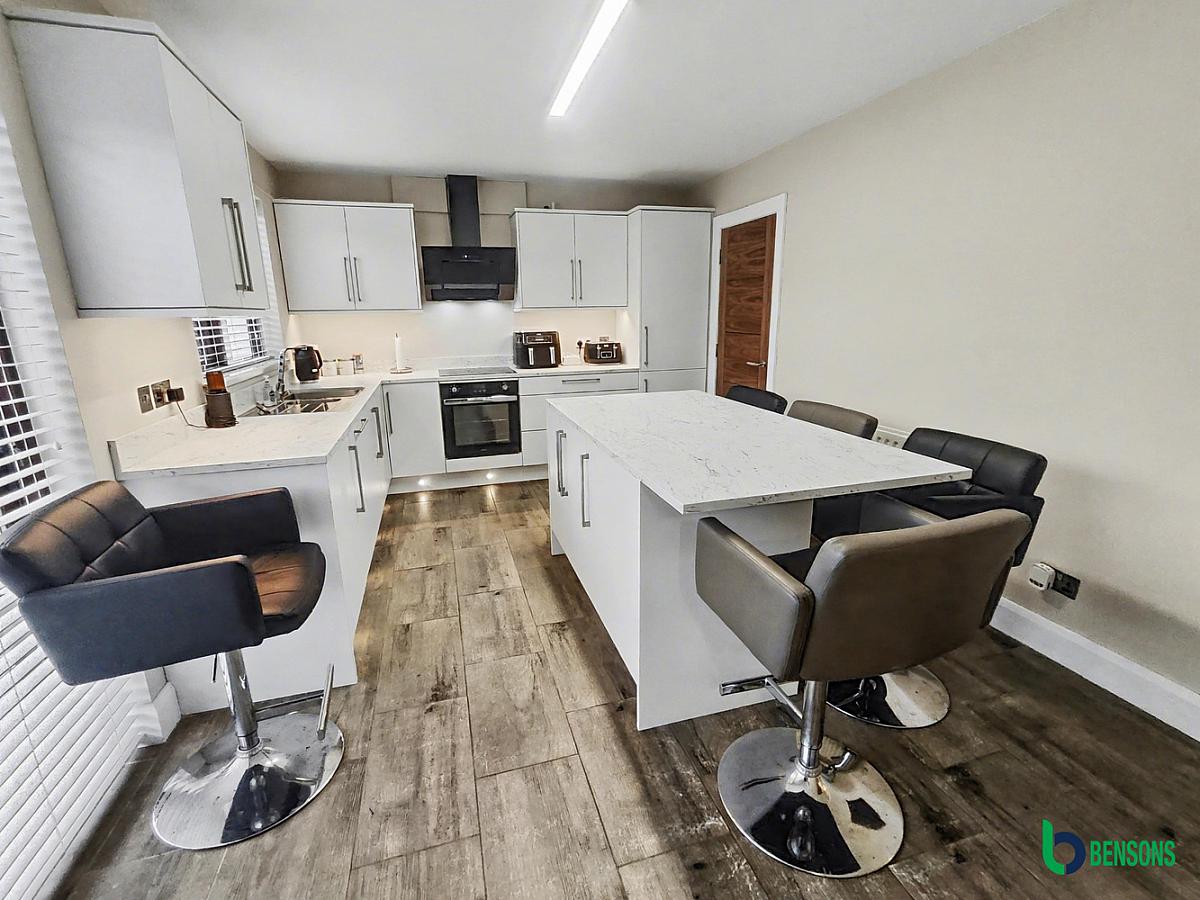 With fully fitted extensive range of eye and low level units with worktops, upstands and under lighting, one and a half bowl stainless steel sink unit, integrated hob and oven with extractor fan, integrated fridge, integrated dishwasher, feature centre / breakfast bar with low level units, under stairs storage and tiled floor.