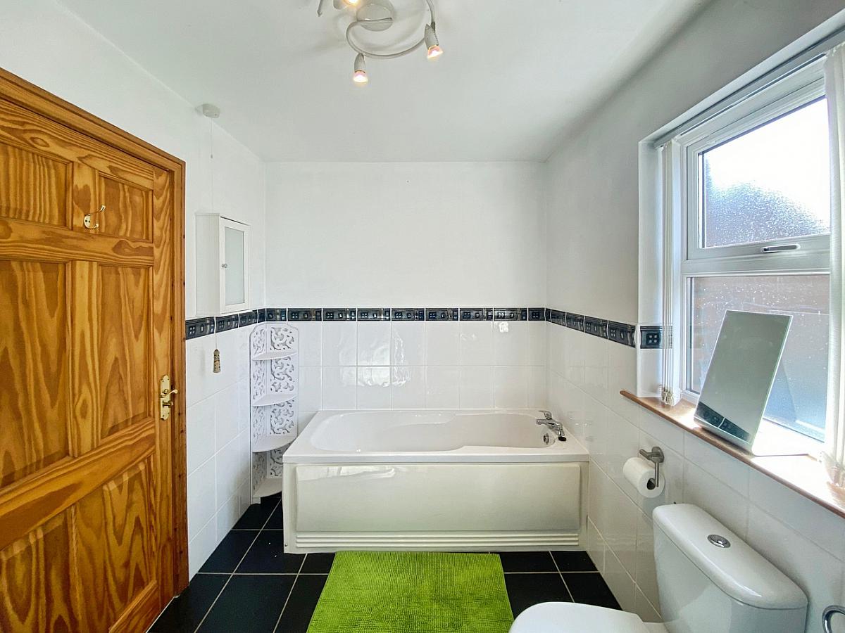 Suite comprising fully tiled walk in shower cubicle, bath, wc, wash hand basin, extractor fan, half tiled walls and tiled floor.