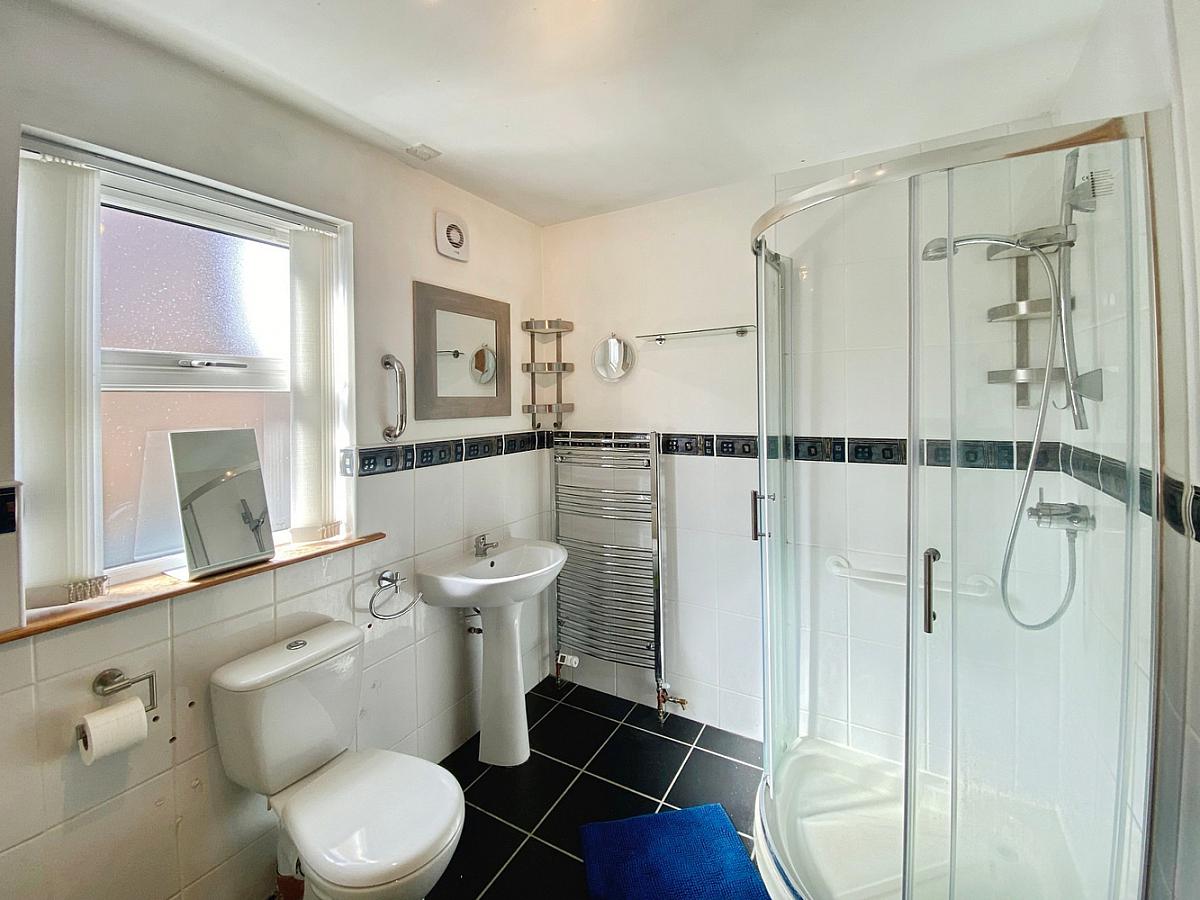 En-suite comprising fully tiled walk in shower cubicle, wc, wash hand basin and tiled floor.