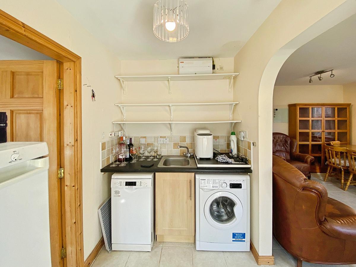 With stainless steel sink unit, low level unit, plumbed for washing machine and tiled floor.