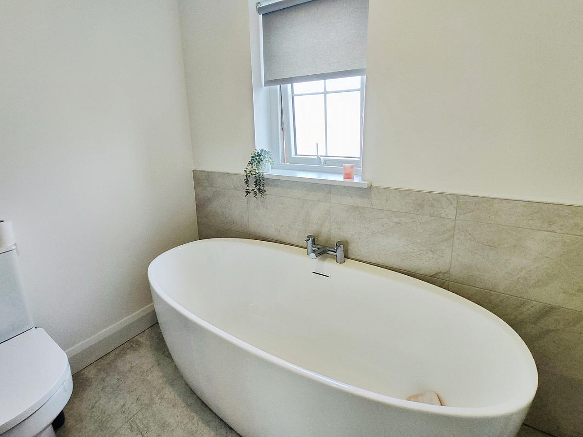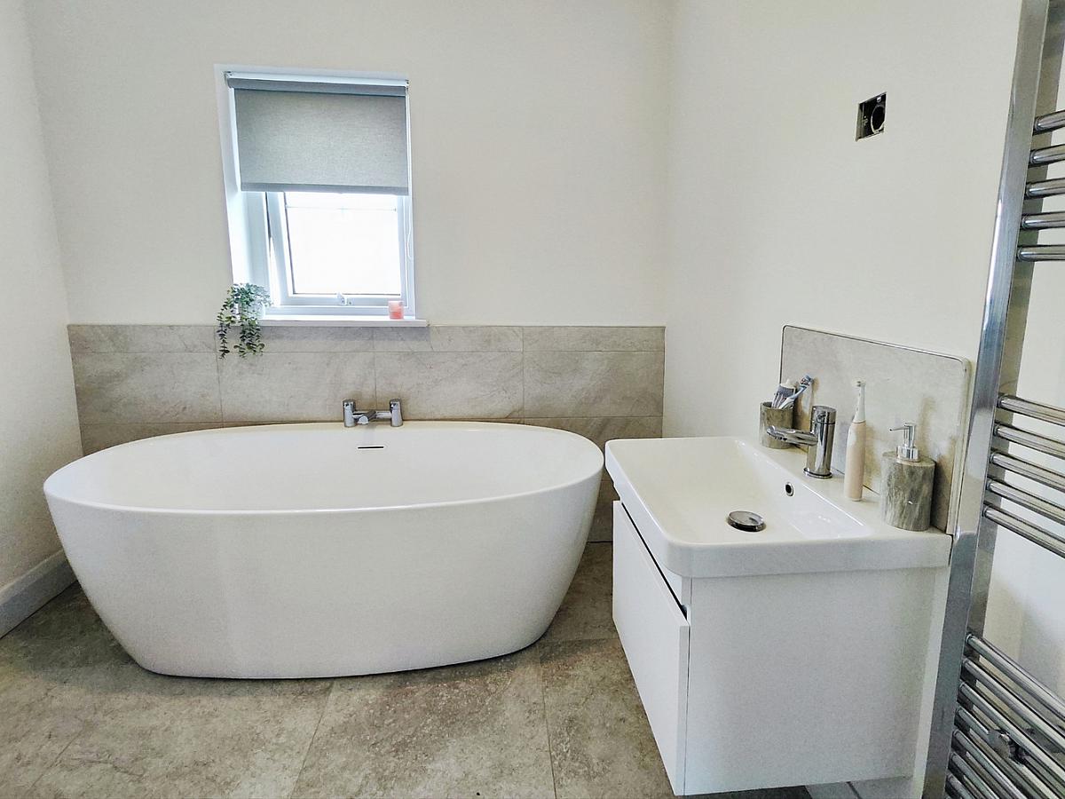 With suite comprising free-standing bath with tiled surround, fully tiled walk in mains shower cubicle with drencher head and handheld shower attachment, vanity unit with wash hand basin and tiled splash back, WC, heated towel rail, extractor fan and tiled floor.