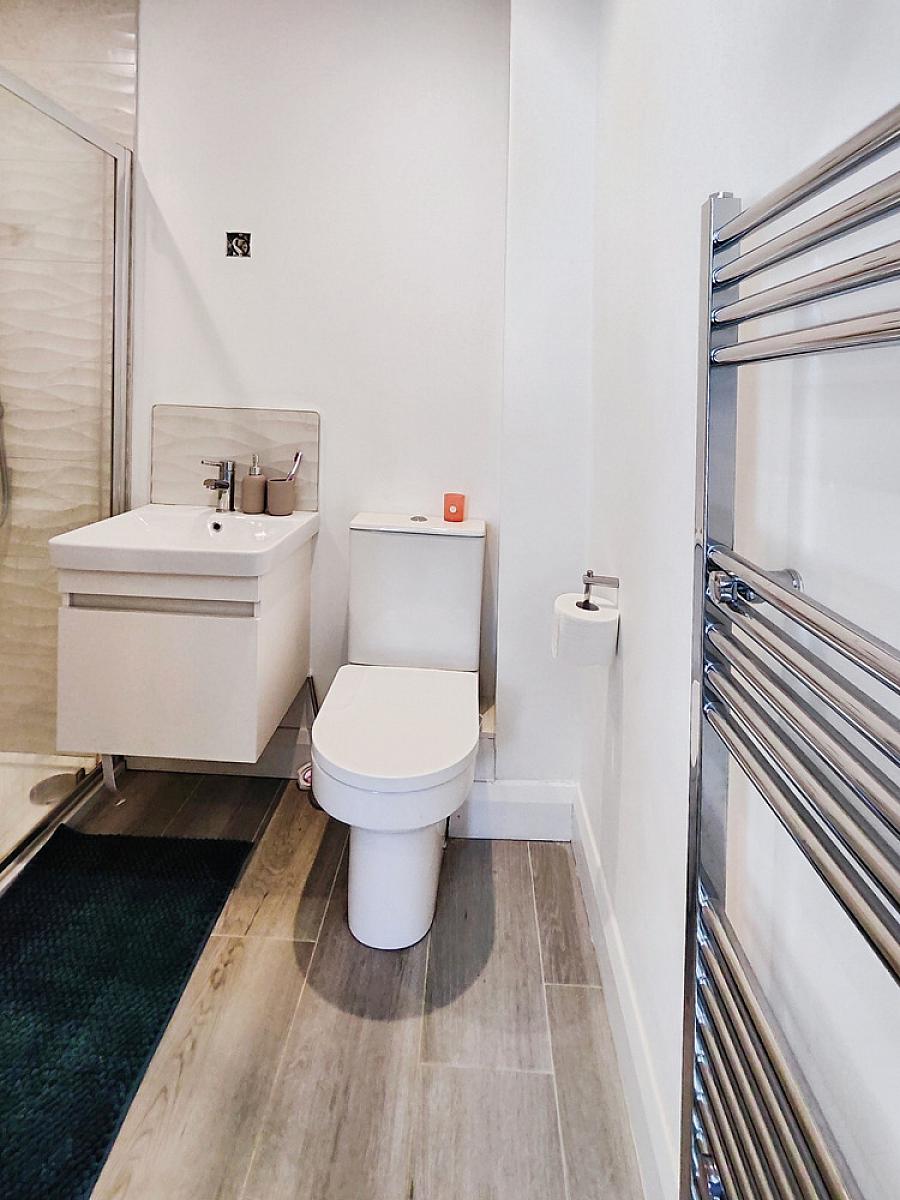 With recessed lighting and walk-in ensuite comprising fully tiled walk-in mains shower cubicle with drencher head and handheld shower attachment, vanity unit with wash hand basin and tiled splash back, WC, heated towel rail, extractor fan and tiled floor.