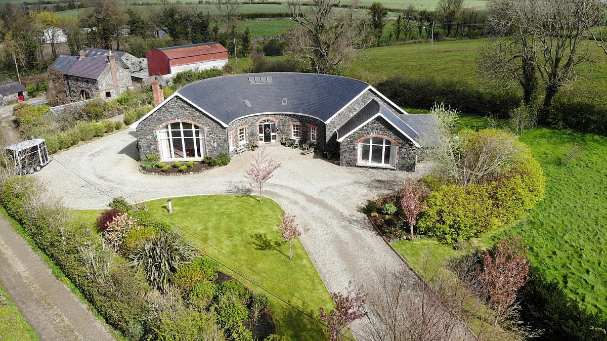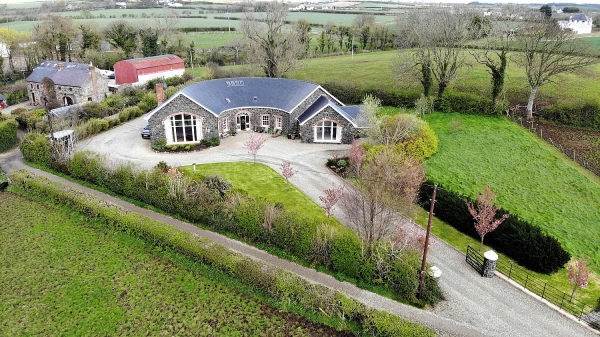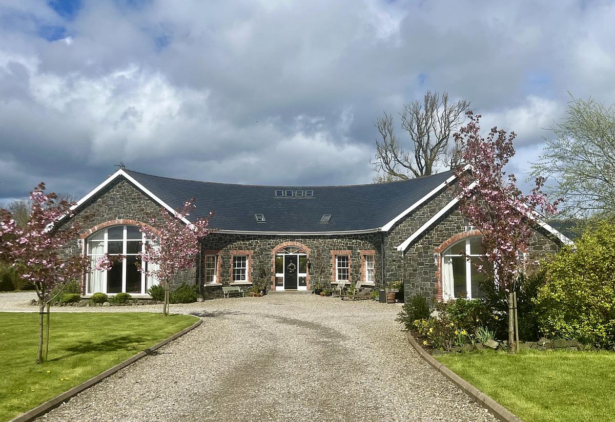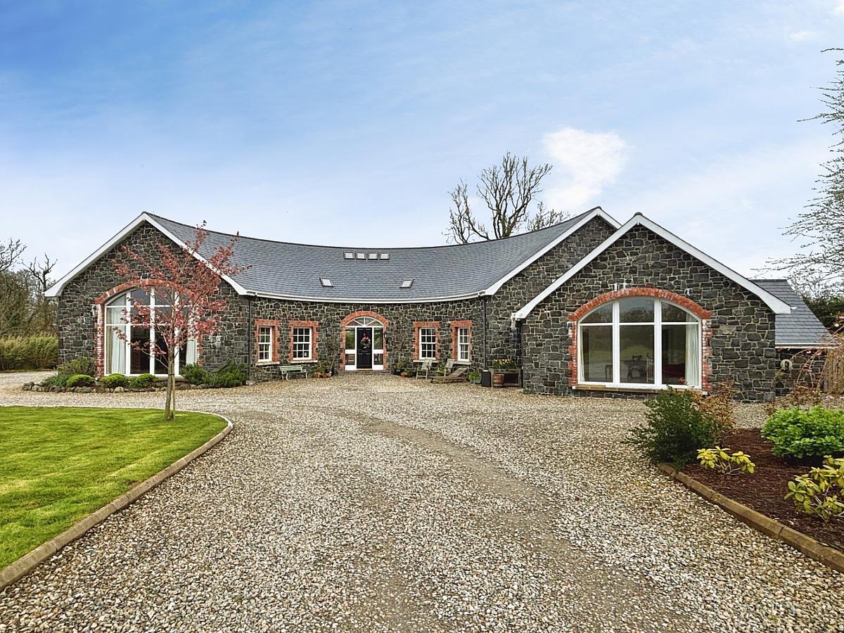 This exceptional detached residence, extending to approximately 3,600 sq ft, offers a rare opportunity to acquire a truly unique family home, thoughtfully designed and lovingly constructed by the current owners circa 2013. Set within a tranquil and idyllic private setting, the property immediately impresses with its distinctive horseshoe-shaped design, complemented by an attractive Dungannon stone front exterior and a beautifully crafted hand-cut tiled roof. The home is accessed via a picturesque cherry tree-lined private lane, creating a sense of arrival and seclusion from the outset.