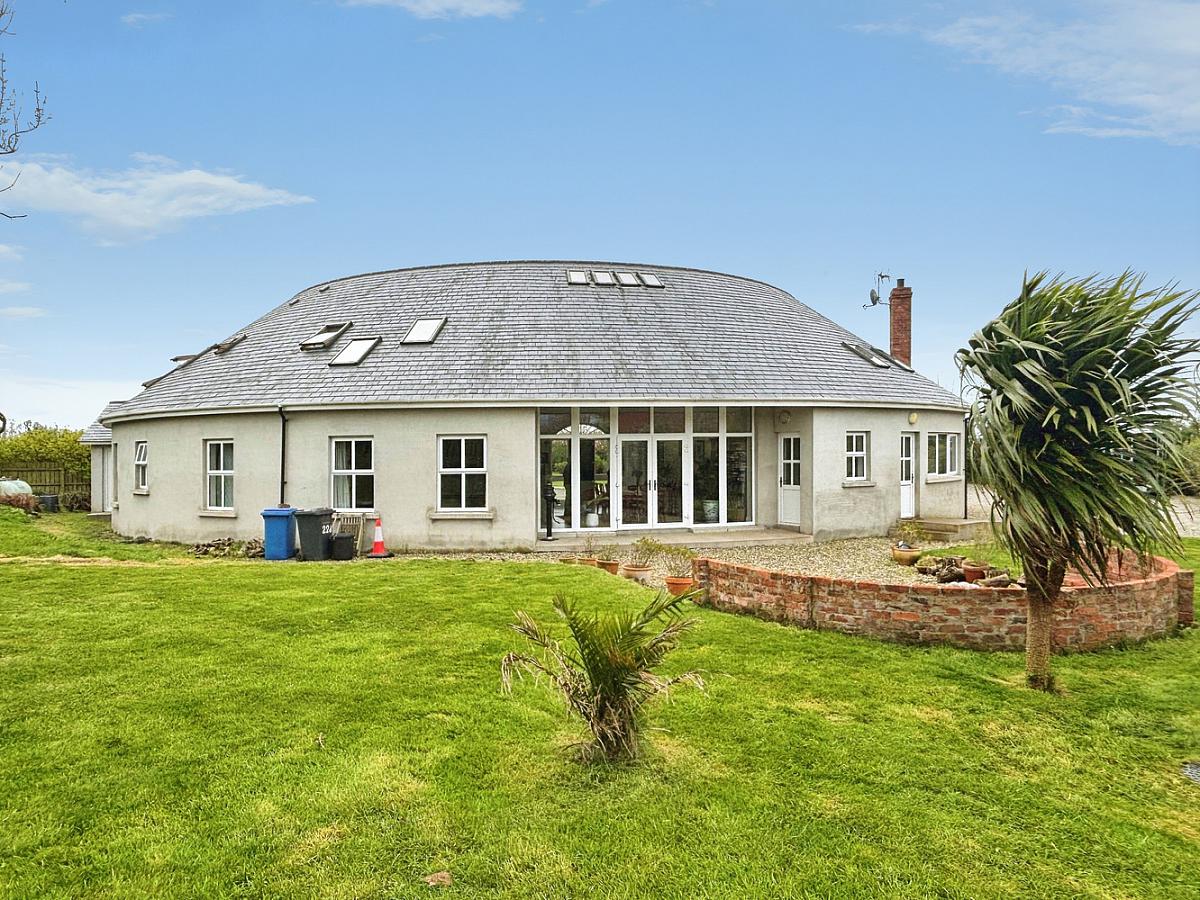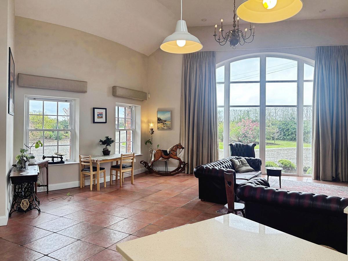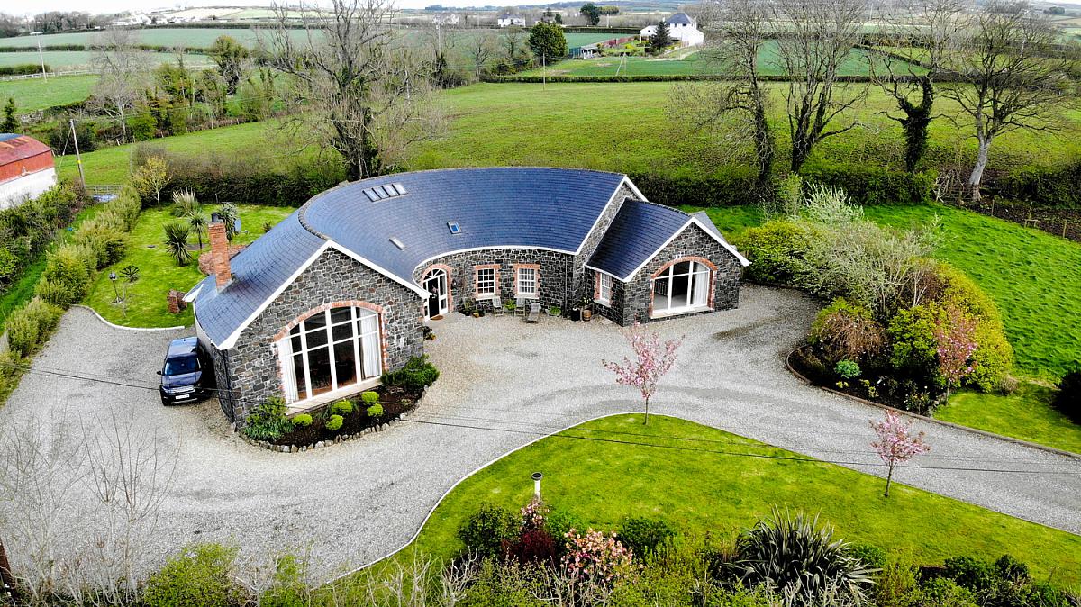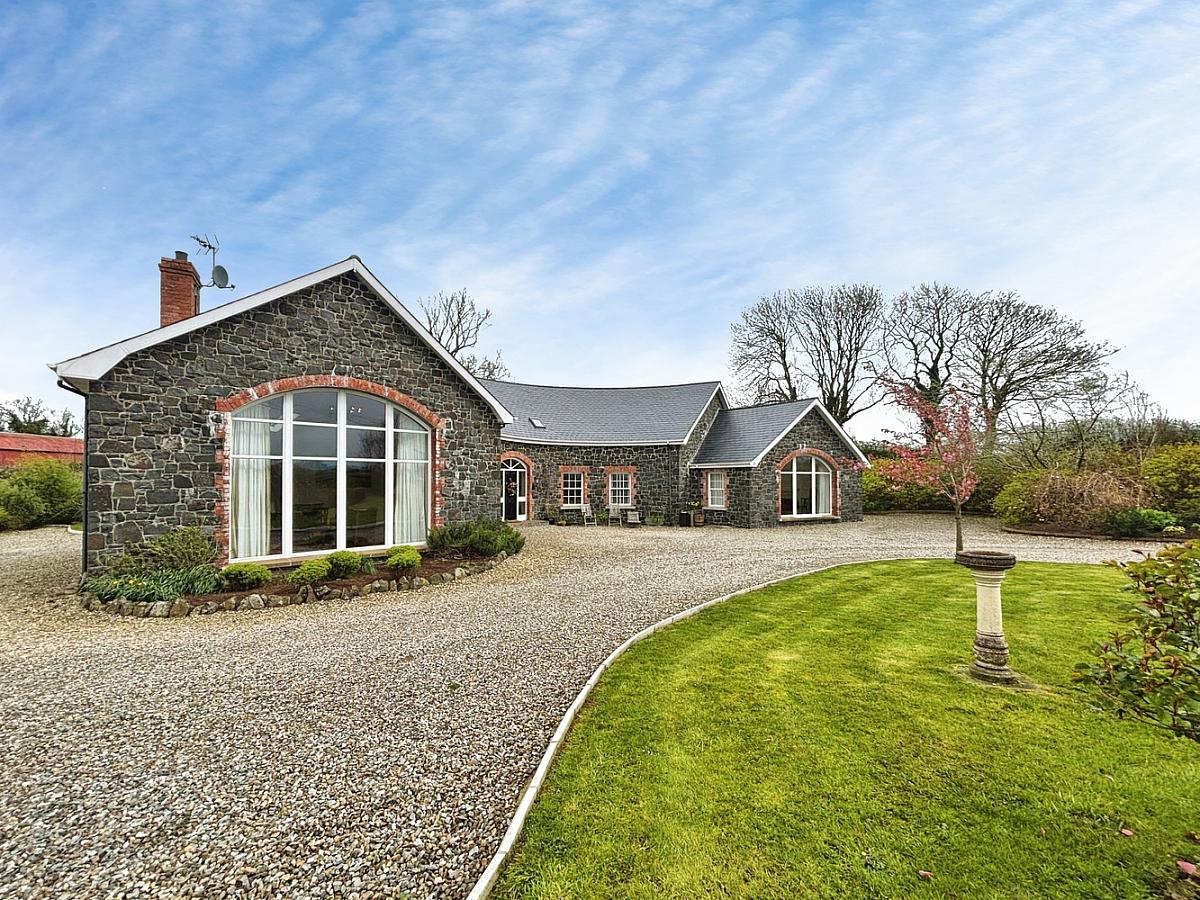 This exceptional detached residence, extending to approximately 3,600 sq ft, offers a rare opportunity to acquire a truly unique family home, thoughtfully designed and lovingly constructed by the current owners circa 2013. Set within a tranquil and idyllic private setting, the property immediately impresses with its distinctive horseshoe-shaped design, complemented by an attractive Dungannon stone front exterior and a beautifully crafted hand-cut tiled roof. The home is accessed via a picturesque cherry tree-lined private lane, creating a sense of arrival and seclusion from the outset.