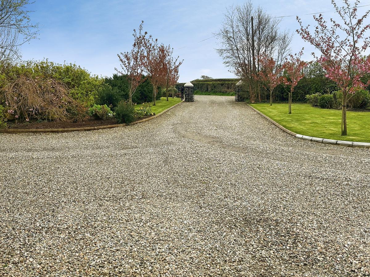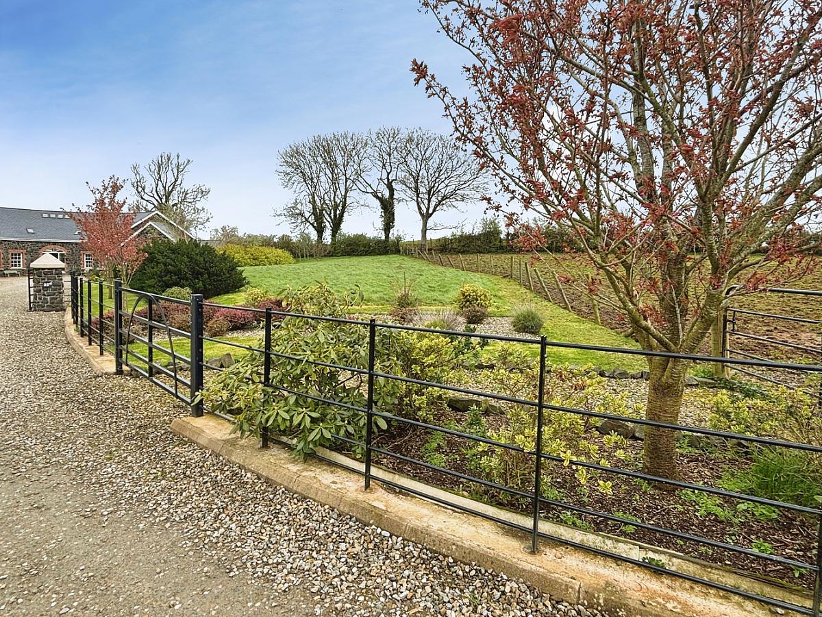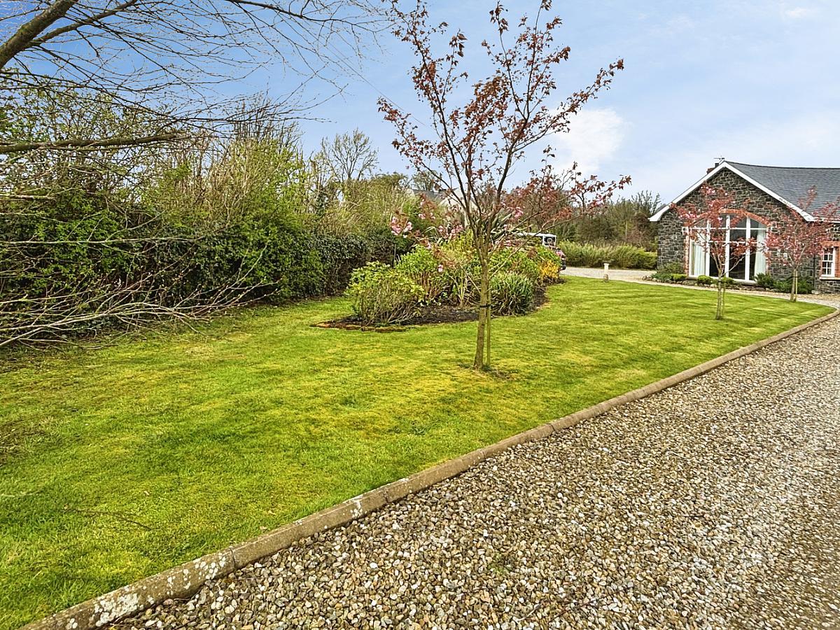 The property is accessed via a picturesque Cherry tree-lined private laneway leading to a stone pillared entrance with double black iron gates approaching a sweeping stoned driveway and parking area to front. Ornate south-facing landscaped gardens to front, side and rear of property dotted with various shrubs and flowerbeds. To the rear is a further extensive stoned area with a feature red brick horseshoe shaped seating area mirroring the shape of the house. The property is enclosed by close board fencing and mature hedging and trees.