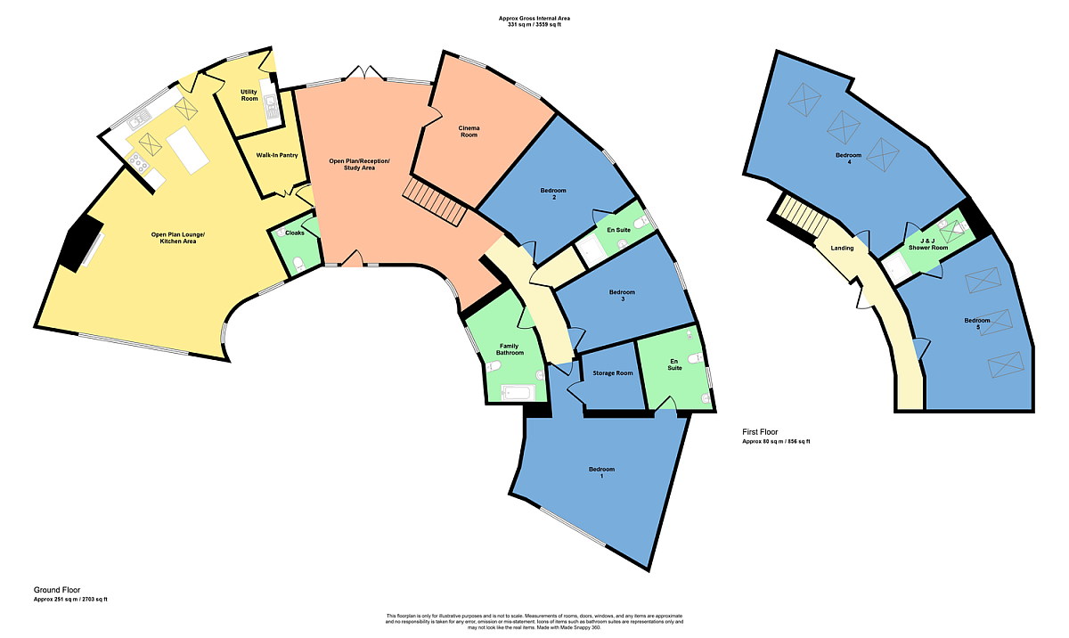 ** Please note due to the unique shape and layout of this property, all measurements, areas, and floor plans are approximate and for illustrative purposes only.