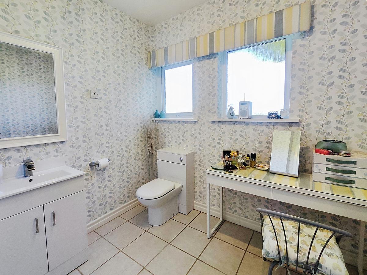 With access to roofspace (part floored). Cloakroom with wc, wash hand basin with under storage and tiled floor.