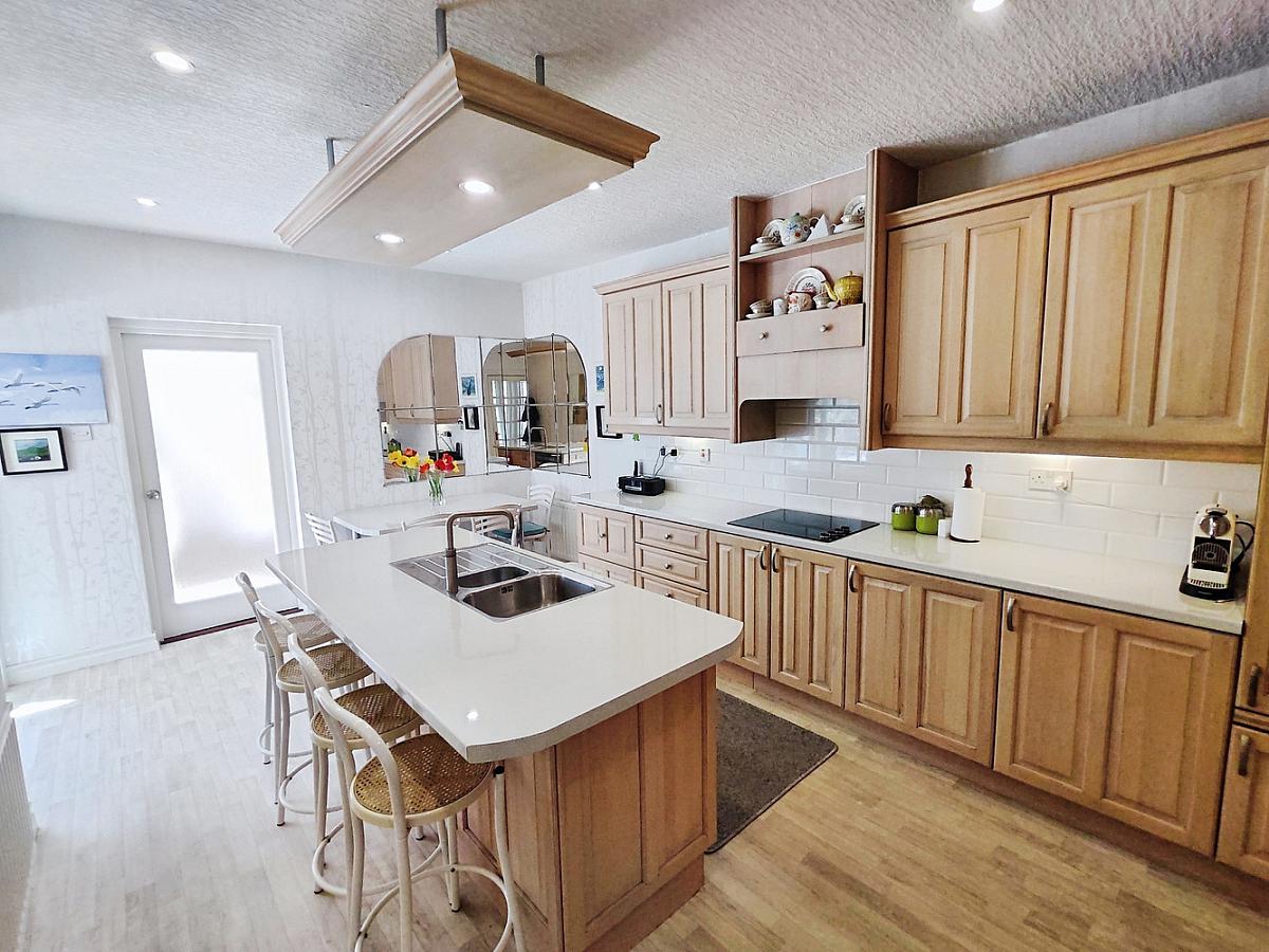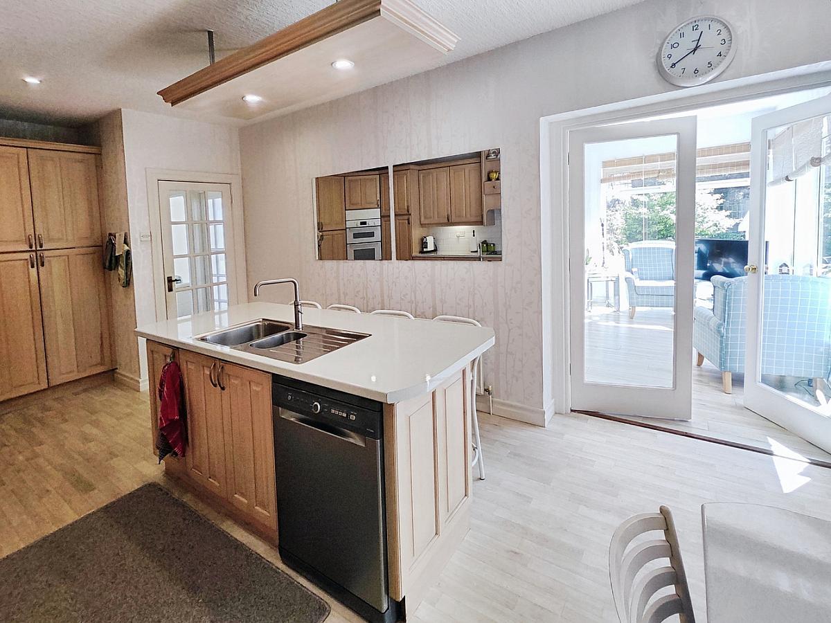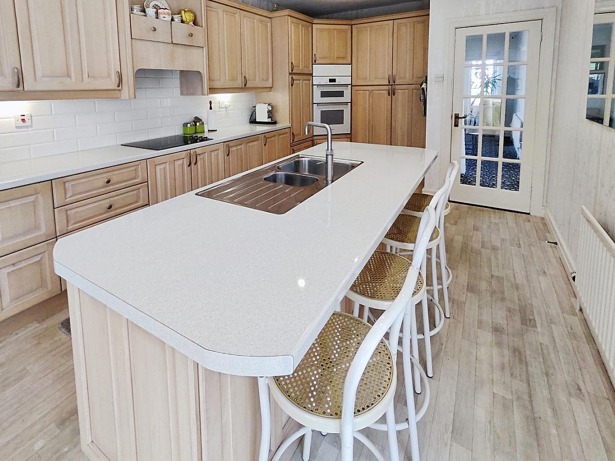 With fully fitted extensive range of eye and low level units with tiling between and under lighting, integrated hob with extractor fan, integrated eye level ovens, integrated fridge, feature centre island / breakfast bar with one and a half bowl stainless steel sink unit and plumbed for dishwasher..