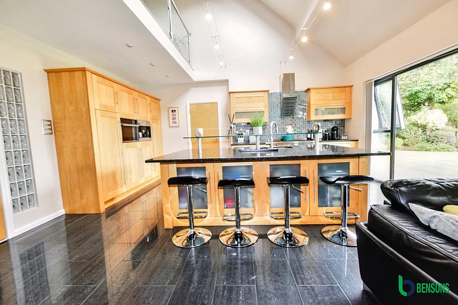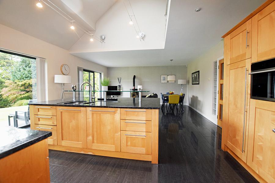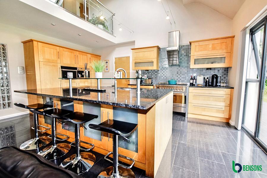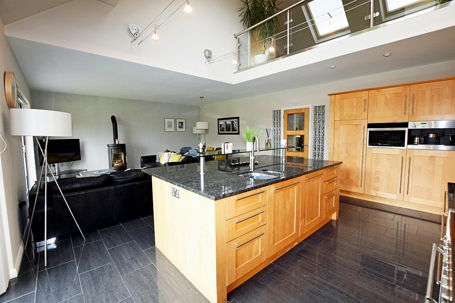With fully fitted extensive range of eye and low level units with quartz worktops, space for range style cooker with extractor fan, integrated eye level oven, feature centre island / breakfast bar with one and a half bowl sink unit and Quooker tap, integrated dishwasher, integrated fridge, integrated freezer, wood burning stove, patio doors leading to rear and tiled floor.