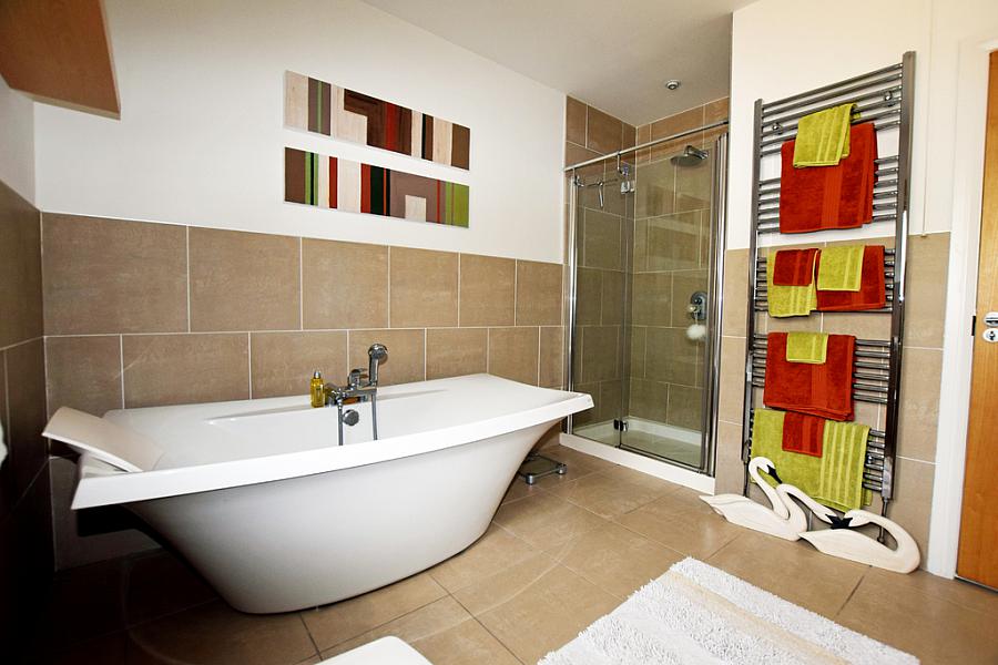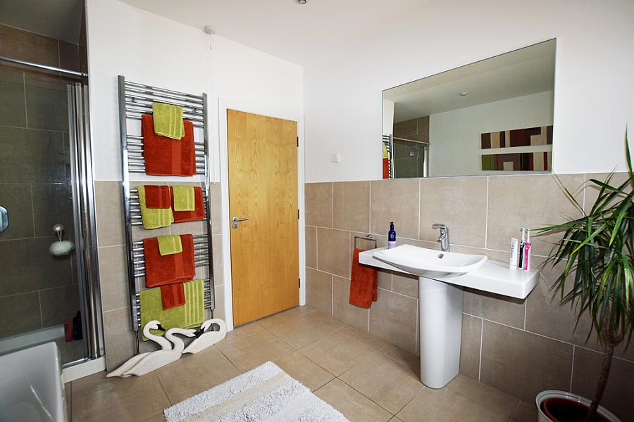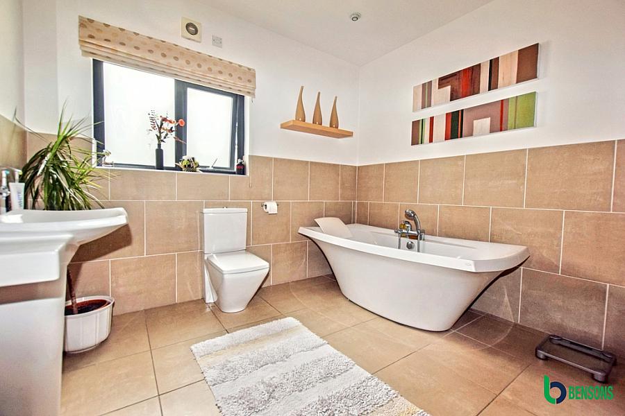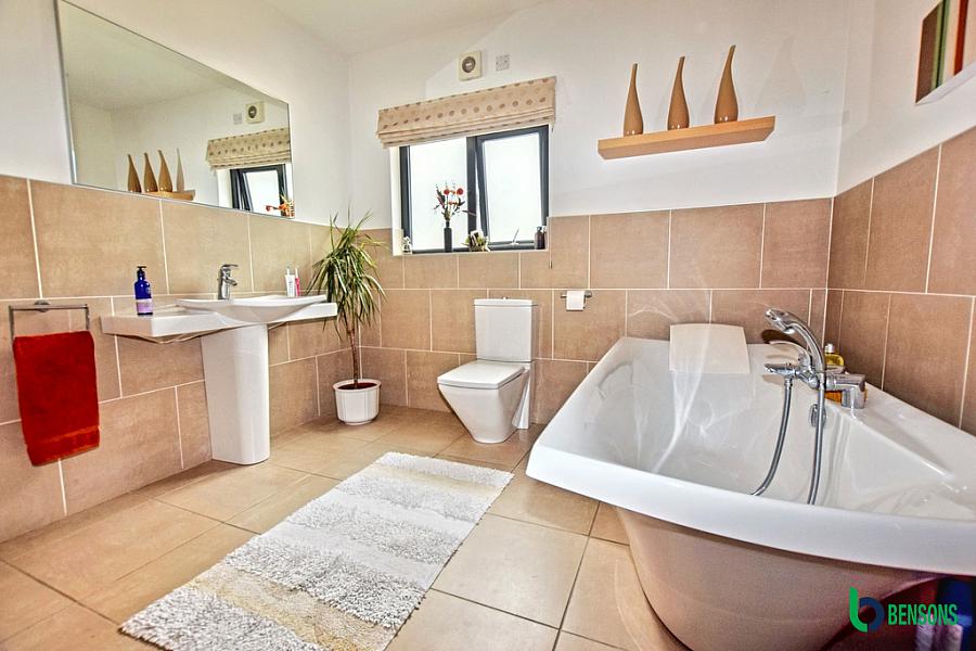 Suite comprising free standing bath with hand shower attachment, fully tiled walk in shower cubicle with mains shower and drencher shower head, wc, wash hand basin, extractor fan, eyeball lighting, half tiled walls and tiled floor.