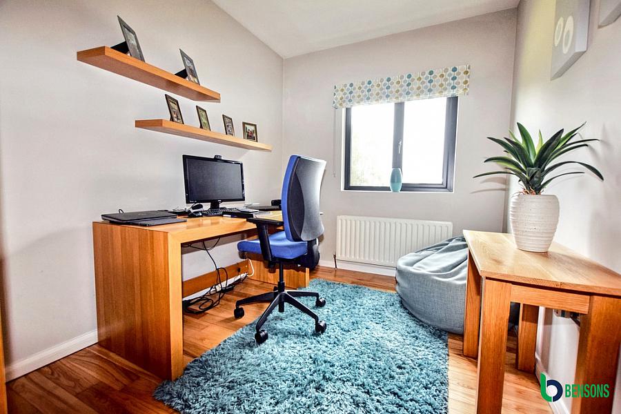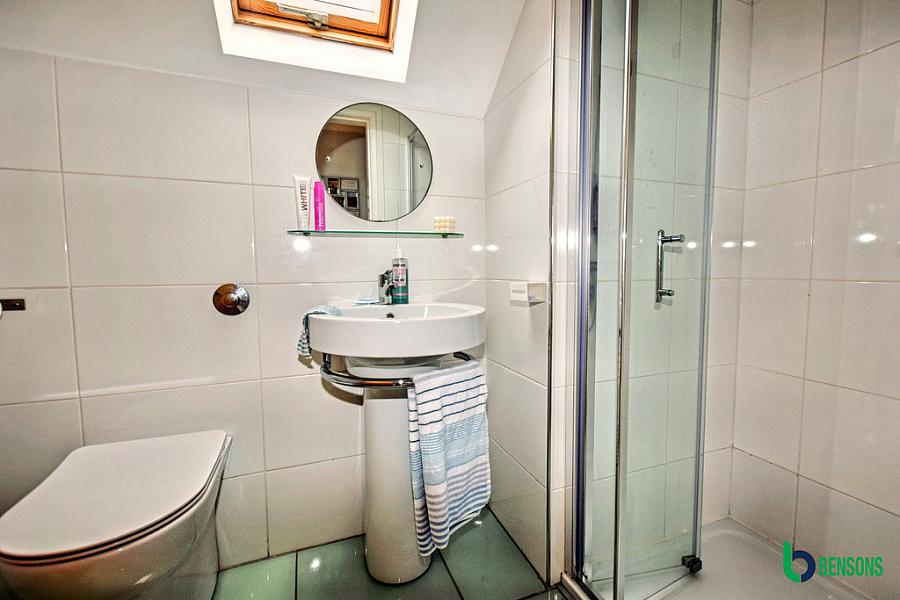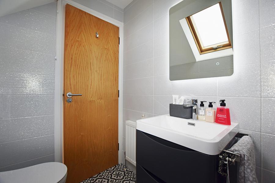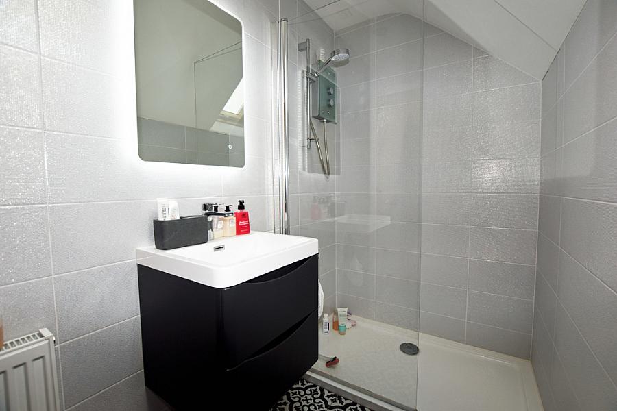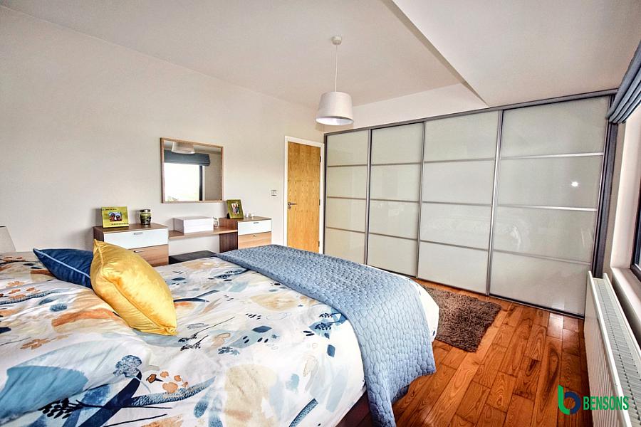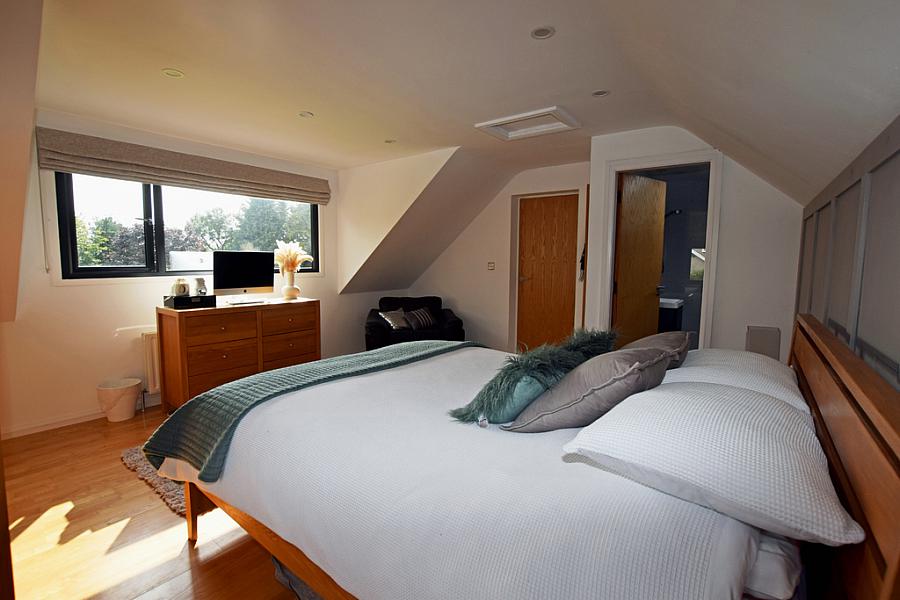 With laminate flooring. En-suite comprising fully tiled walk in shower cubicle, wc, wash hand basin, extractor fan, recessed lights, tiled walls and flooring.