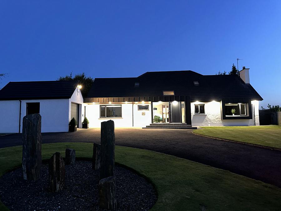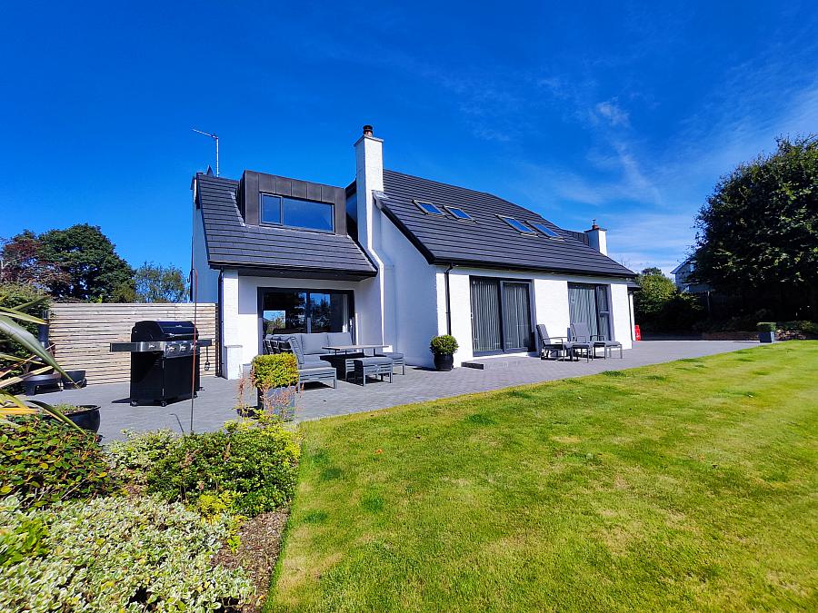 Property approached by tarmac driveway with tuning circle and EV charger. Mature gardens to front laid in lawn with selection of mature trees, plants and shrubs enclosed by fence and hedging. Rear garden laid in lawn with extensive paved patio area and path leading to private jetty on the River Bann.