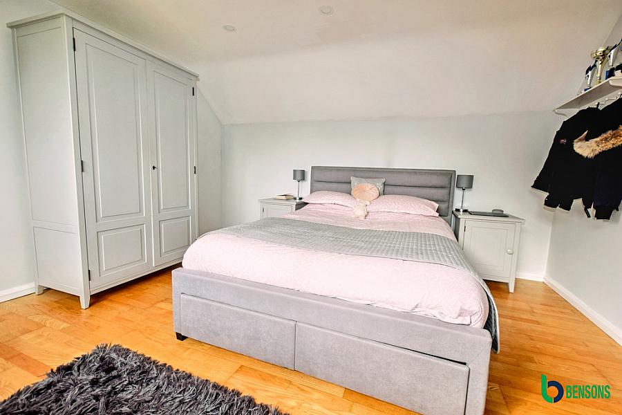 With feature panelled wall, recessed lights and laminate flooring. En-suite comprising fully tiled walk in shower cubicle, wc, wash hand basin with under storage, extractor fan, recessed lights, tiled wall and flooring.