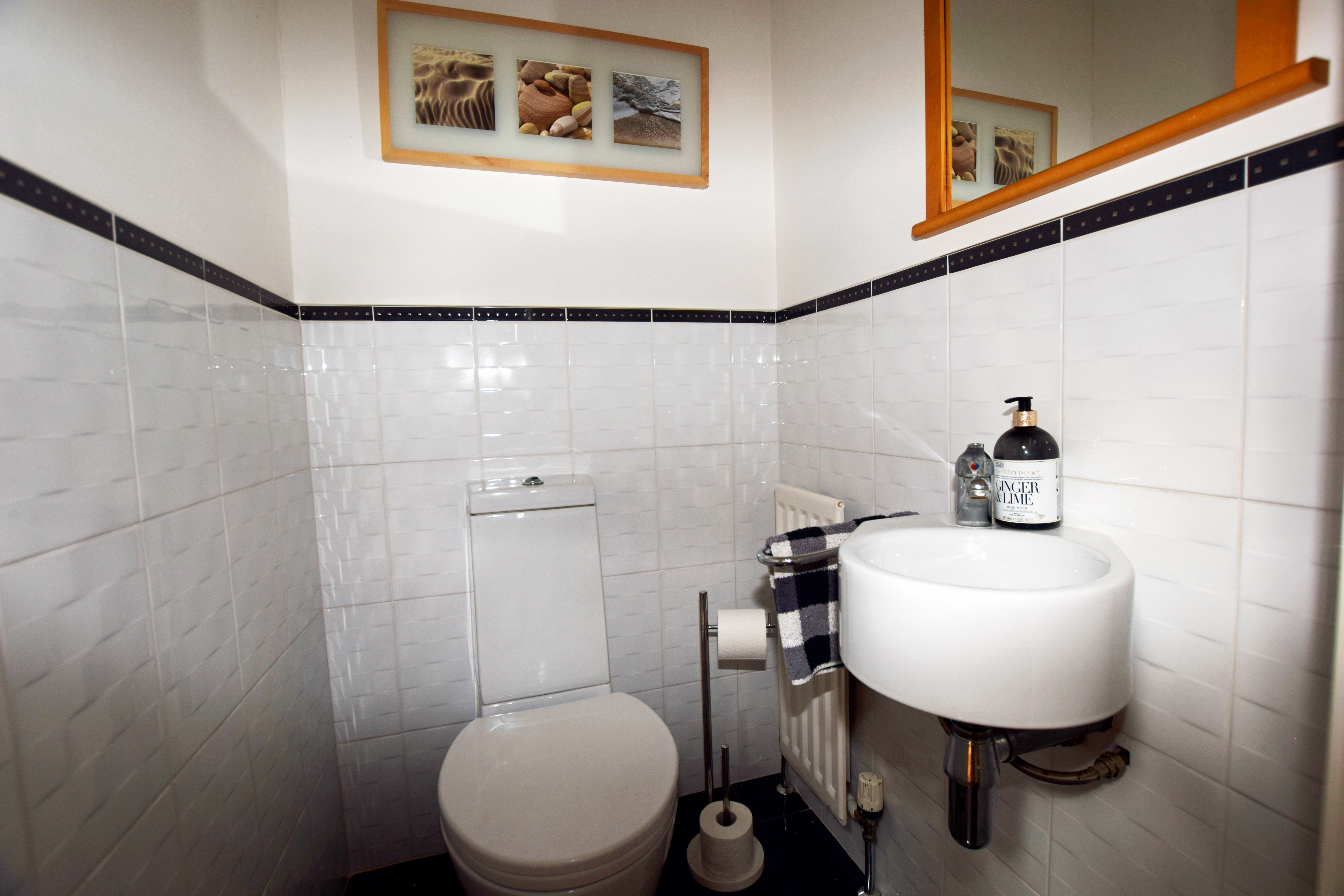 Comprising wc and wash hand basin, extractor fan and tiled floor.