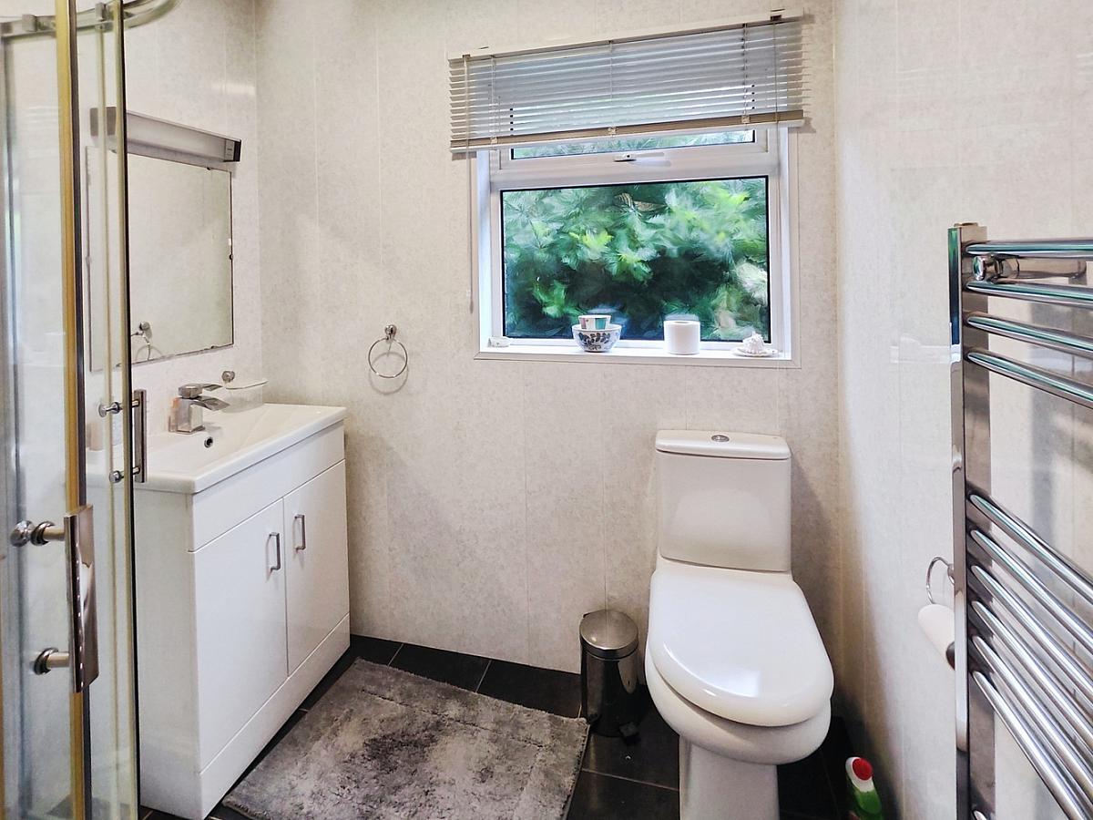With PVC panelled walk in shower cubicle, wc, wash hand basin with under storage, PVC panelled walls, heated towel rail and tiled floor.