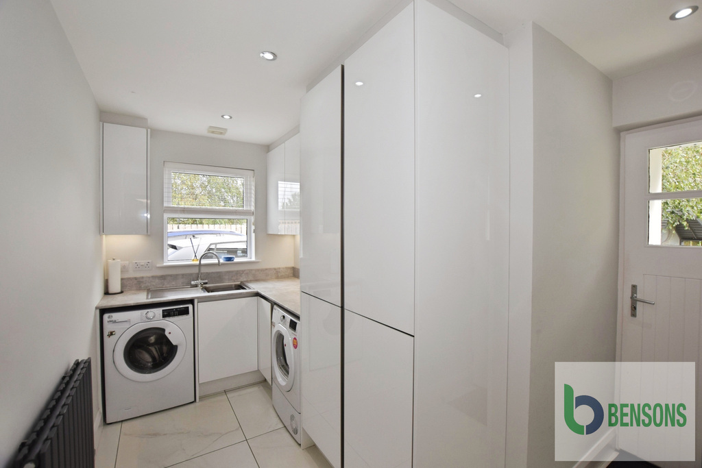 With extensive range of fully fitted cabinets which includes eye & low level units with concealed under lighting, stone worktop and upstand with undermounted double sink unit with 'Quooker' tap, feature centre island with "Dekton"worktop, integrated 'Air force' induction hob, 'Siemens' double ovens one with warming drawer and both are wifi compatible and with built in microwaves, Intergraded full size fridge & freezer, 'Bosch' dishwasher wifi compatible, wine rack, walk-in pantry with shelving & censored light, sockets with USB, electric fire inset, TV point, "55" inch flat screen TV with "Bose" sound bar, porcelain tiled floor, Wi-Fi extender, blinds controlled via remote, French doors and slider door leading to rear garden. Measurements to widest points.