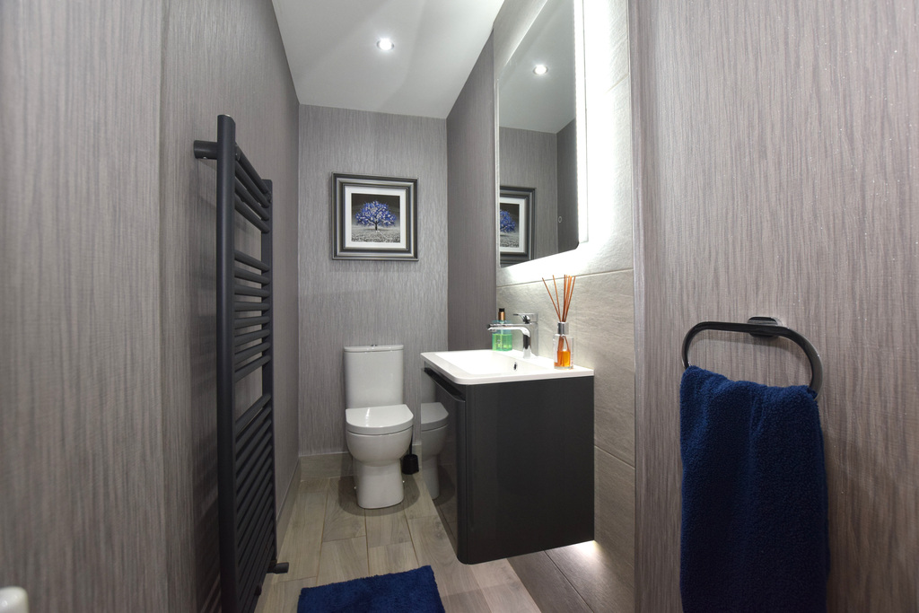 With coved ceiling and laminate flooring. Cloakroom comprising WC, floating wash hand basin with "Villeroy & Boch" tap, tiled splash back and concealed underlighting, led mirror, heated towel rail, recessed ceiling lights, extractor fan and tiled floor.