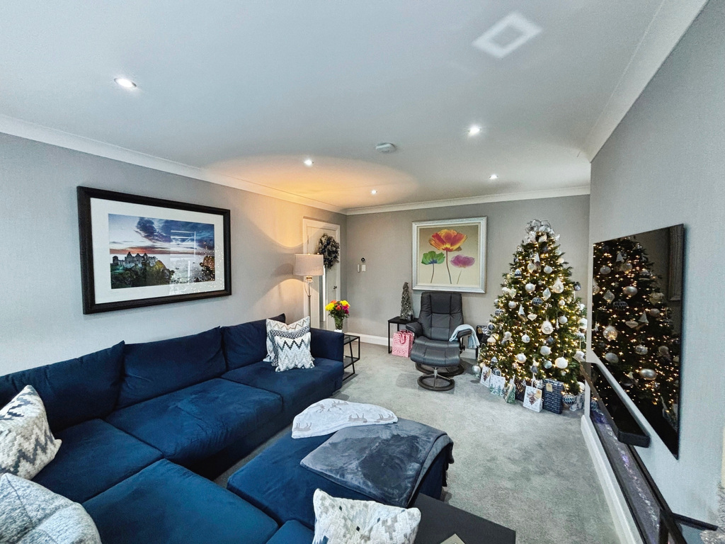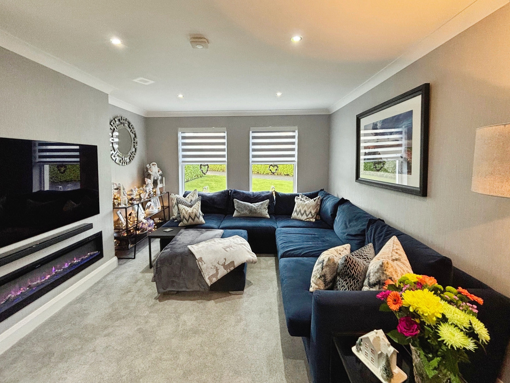 With electric fire inset, "65" inch flat screen TV with "Bose" surround bar, sockets with USB, blinds controlled via remote, coved ceiling and recessed ceiling lights.
