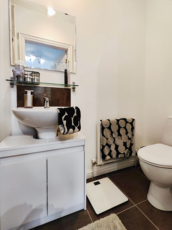 With cloaks cupboard and tiled flooring. Cloakroom comprising wc and wash hand basin with extractor fan and tiled floor.