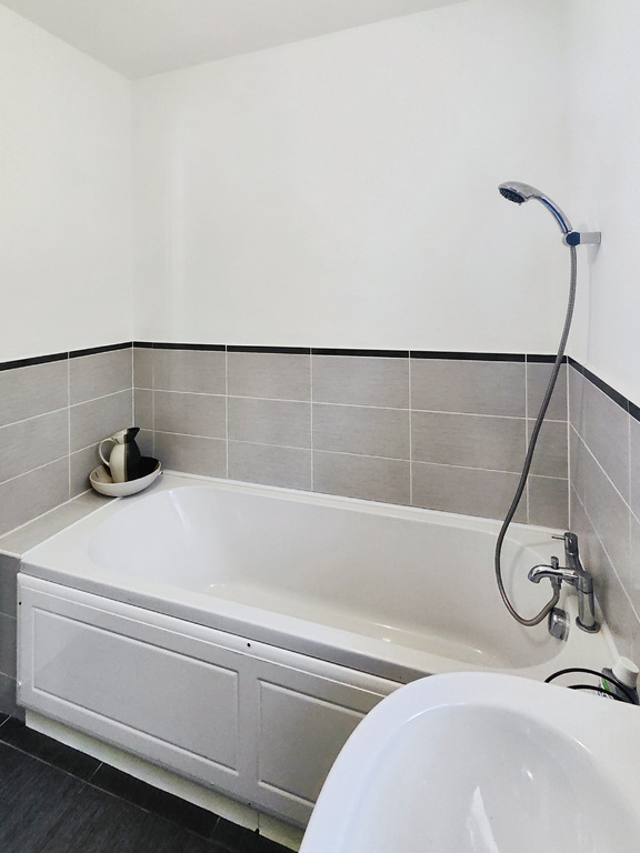 Suite comprising PVC panelled walk in shower cubicle, bath with hand shower attachment, wc, wash hand basin, extractor fan, half tiled walls and tiled floor.
