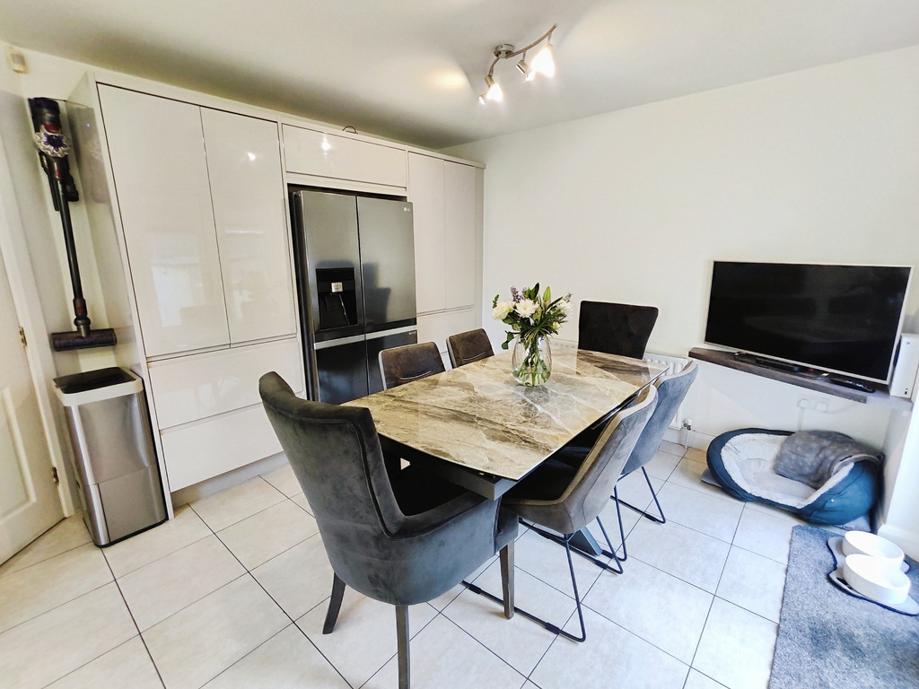 With fully fitted extensive range of eye and low level unit with tiling between and underlights, integrated hob and oven with extractor fan, integrated dishwasher, space for fridge/freezer, sink unit, tiled flooring and French doors leading to rear.
