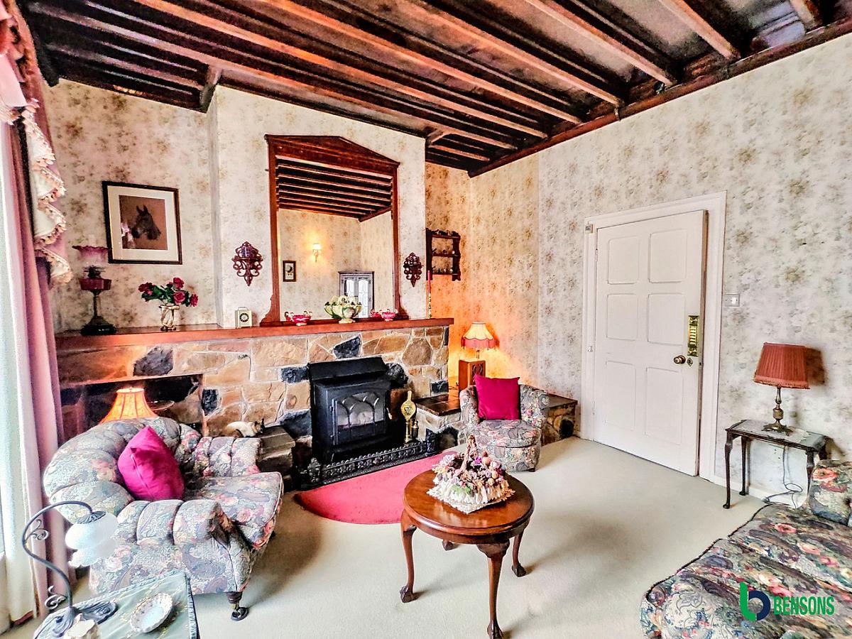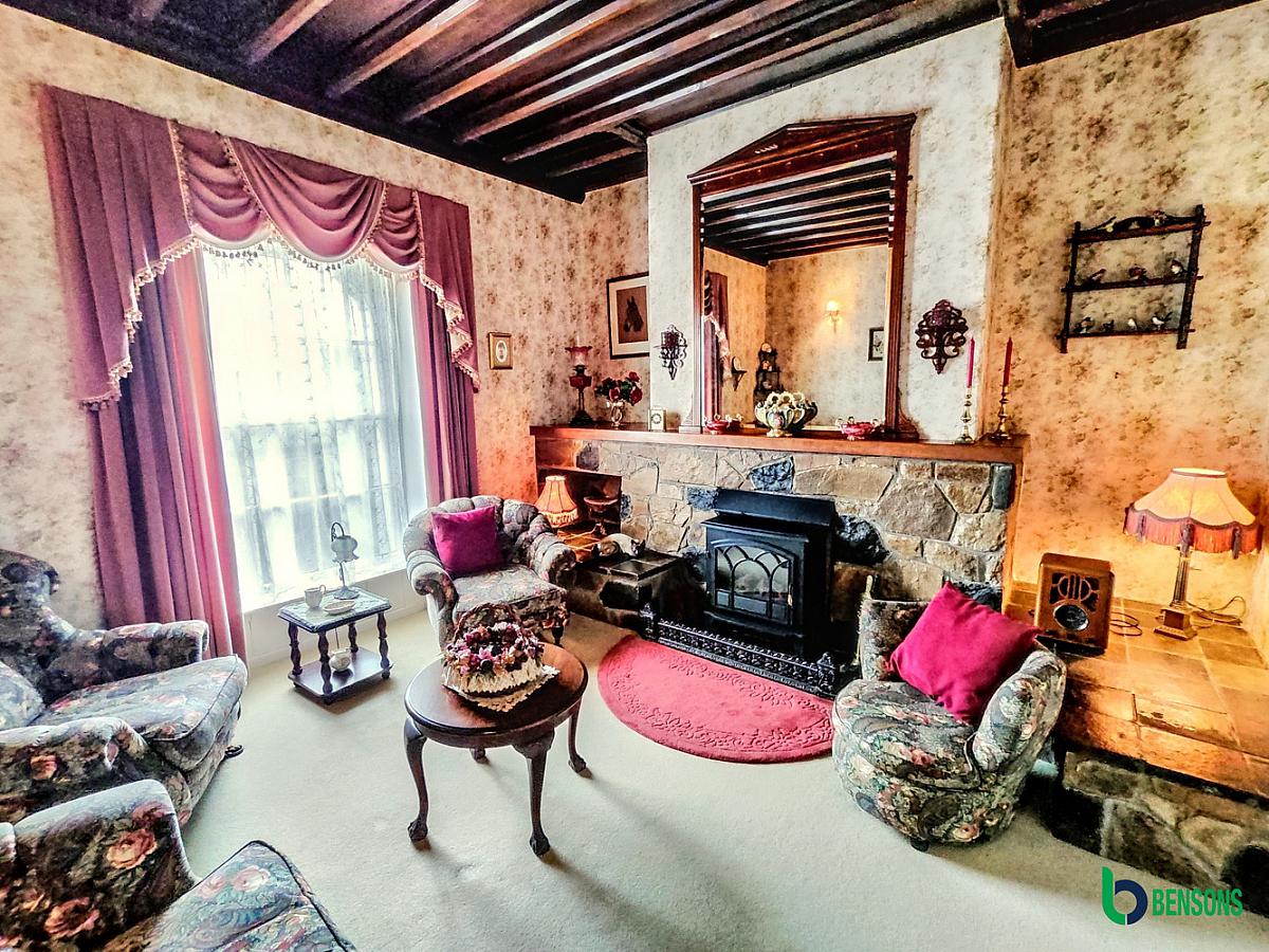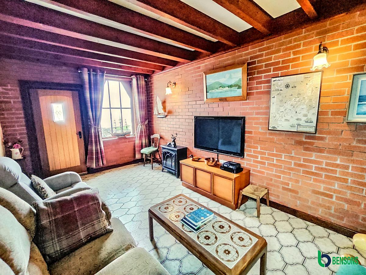 With beamed ceiling, points for wall lights, sea view, feature fireplace electric fire inset with stone tiled hearth, stone cladded surround and wooden mantle.