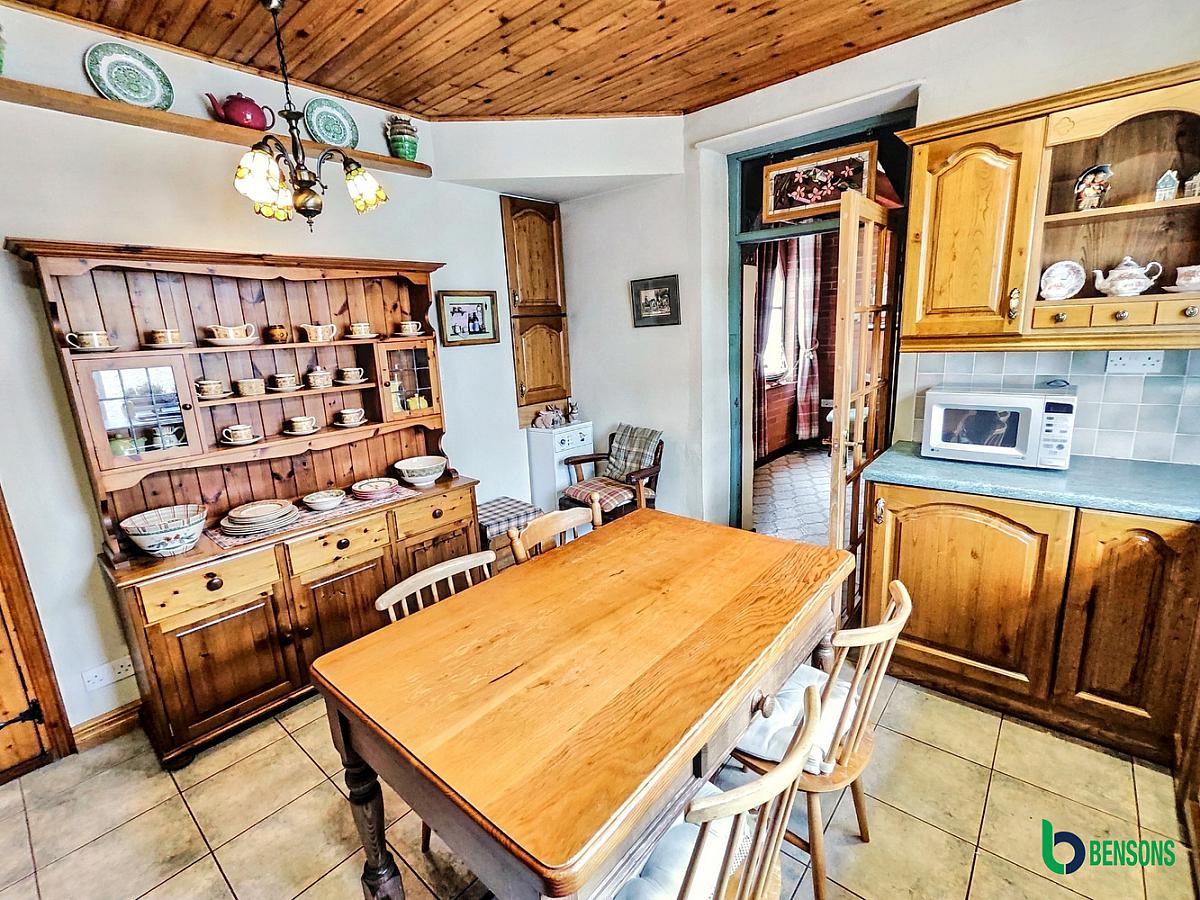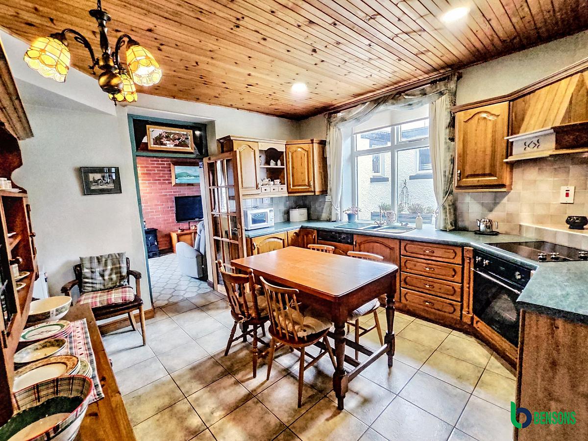 With range of fitted solid wood eye & low level units, sink unit with mixer tap, tiling around worktop, concealed lighting, integrated dishwasher, integrated hob & oven with extractor above, larder cupboard, pine strip ceiling, recessed ceiling lights and tiled floor.