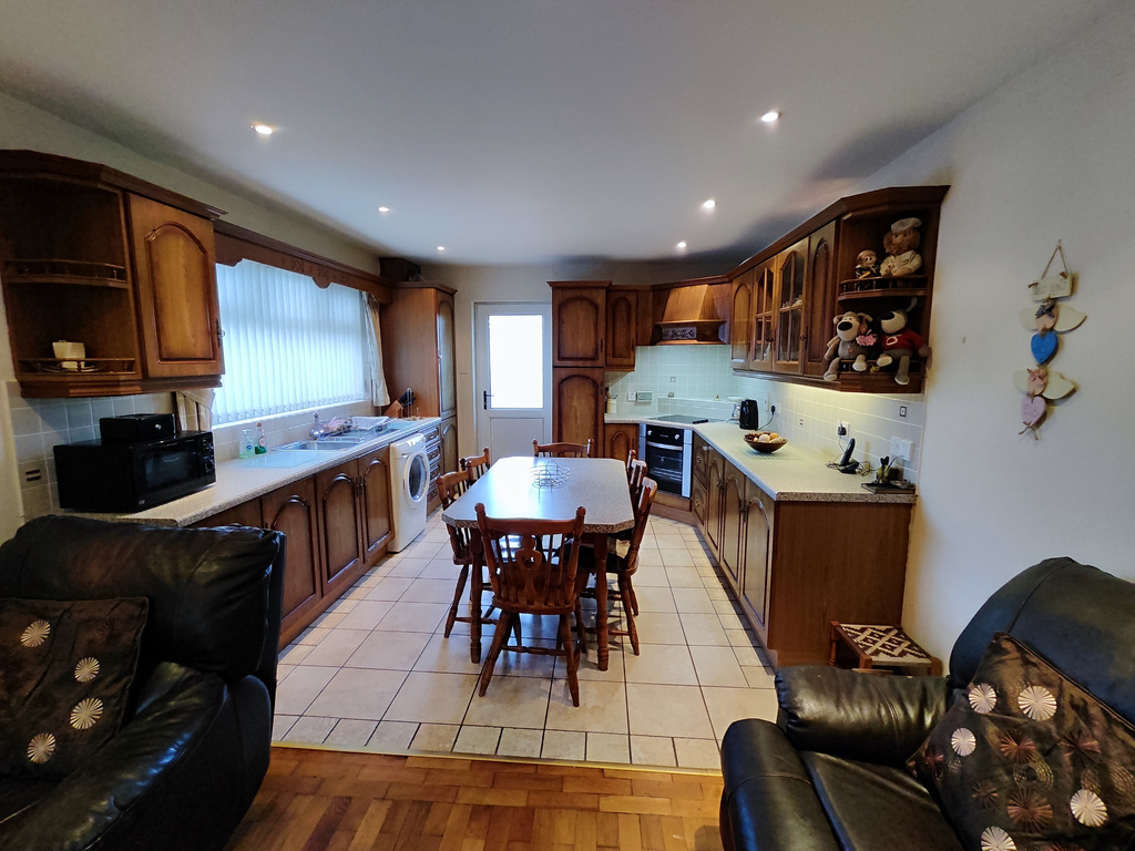 With fully fitted extensive range of eye and low level units with tiling between, stainless steel sink unit, integrated hob and oven with extractor fan, integrated fridge/freezer, plumbed for washing machine, glass display cabinet and part tiled and wooden floor.