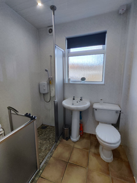 With walk in PVC paneled shower area, wc, wash hand basin and tiled floor.
