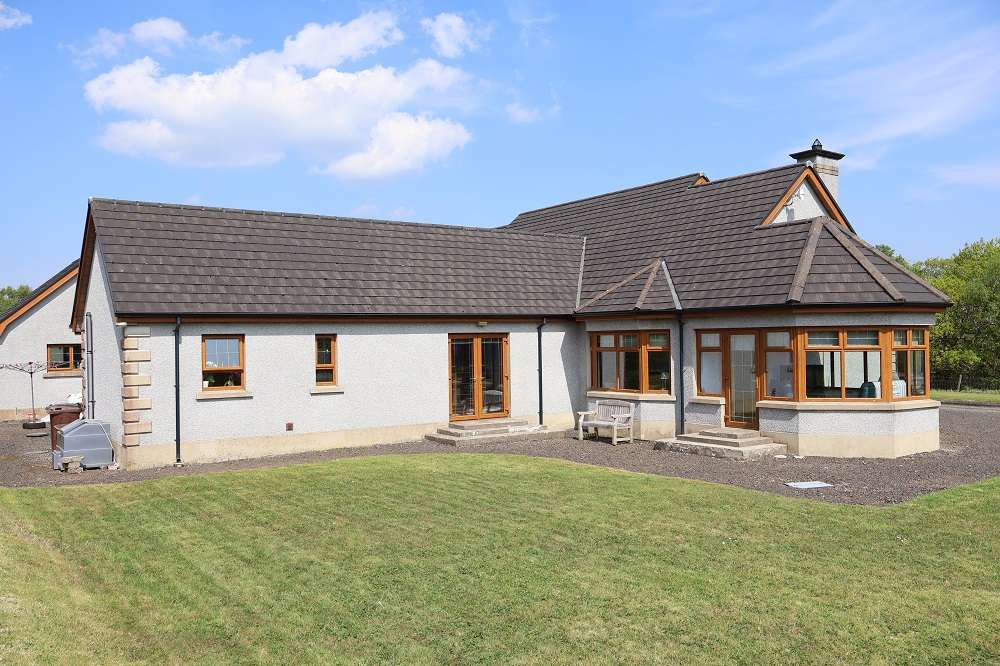 Exterior :The property is approached by a shared gravel driveway with stone pillars and timber gates to entrance. The gardens are laid out in lawns to front, side and rear of dwelling enclosed by stockproof fencing. There is a gravel driveway with spacious parking areas leading and Detached Double Garage. Outside lights and water tap. PVC oil tank. Septic tank sewage system.